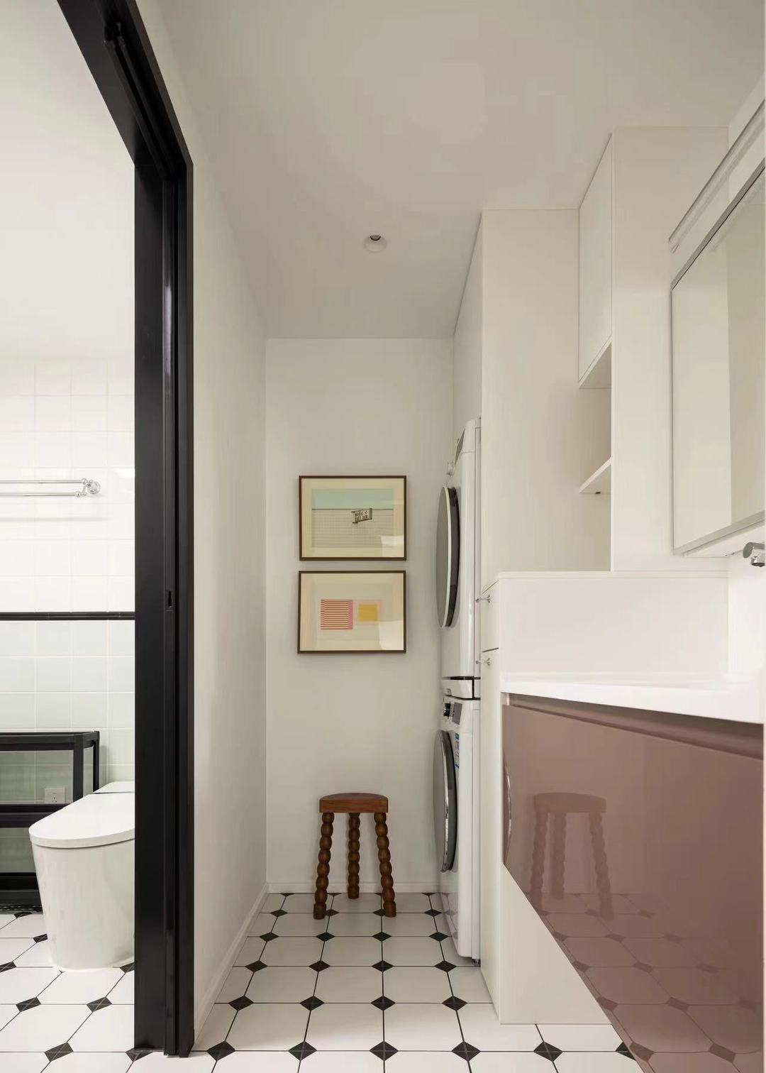 卫生间干湿分区,镜柜与浴室柜满足储物需求。淋浴间墙面绿色+白色方砖搭配黑色腰线,地面黑白拼色花砖让整体空间复古清新;淋浴头、五金等统一选购不锈钢让空间统一,展现小细节里的浪漫。