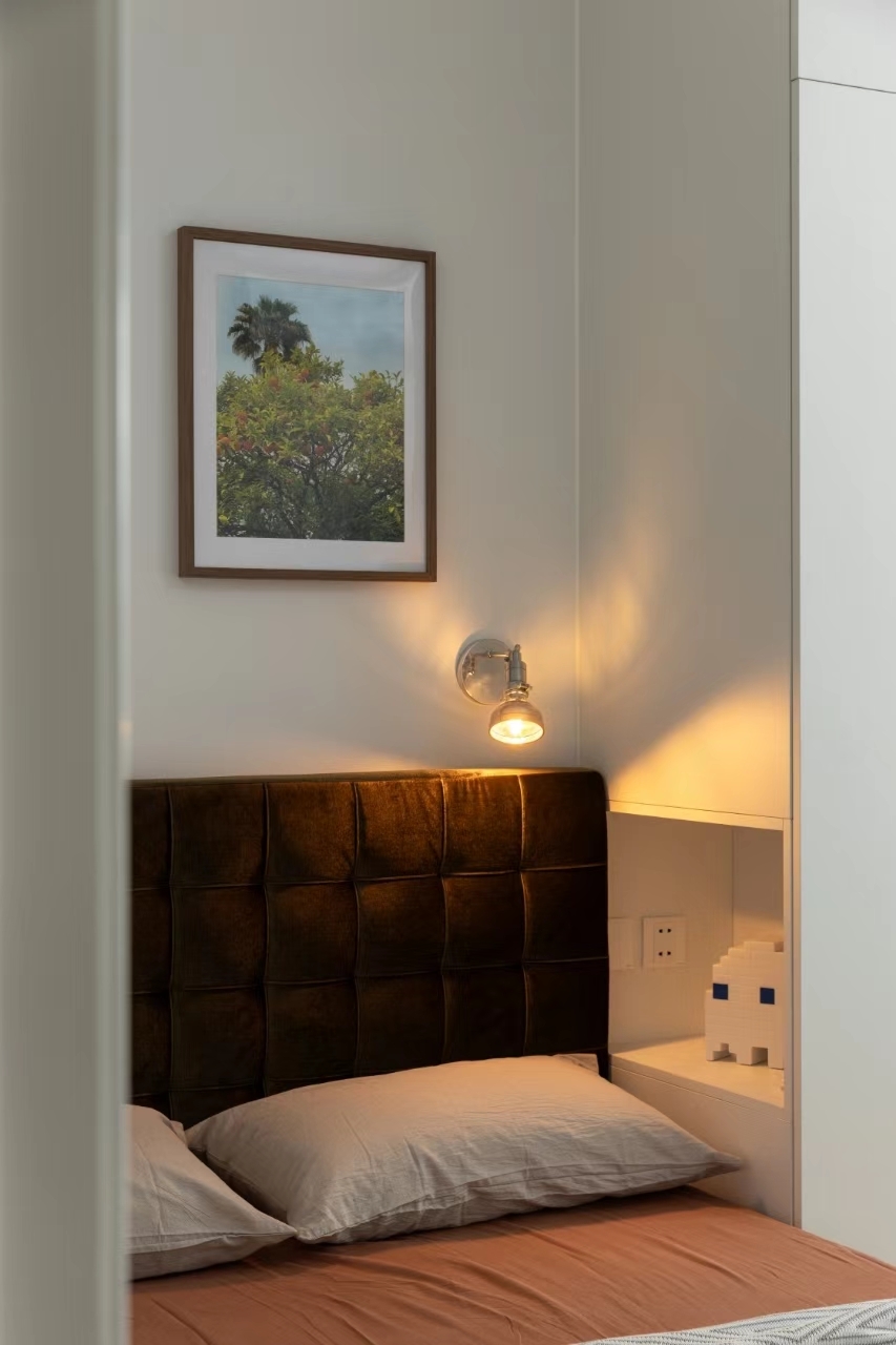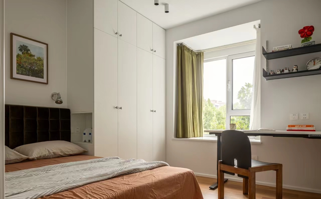 收纳柜满足日常收纳功能,衣柜侧方开放式置物格更节省空间。采光最好的位置留给书桌,在这里阅读办公,疲惫时一眼就可以看到窗外风景。整体清新复古的调性让房间更温馨。