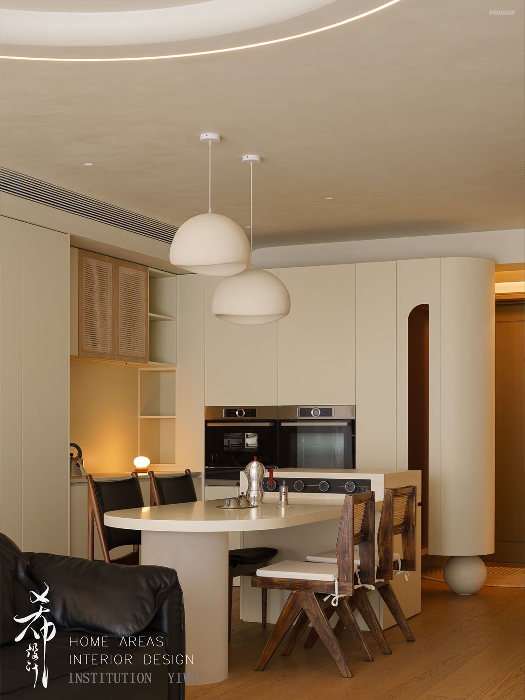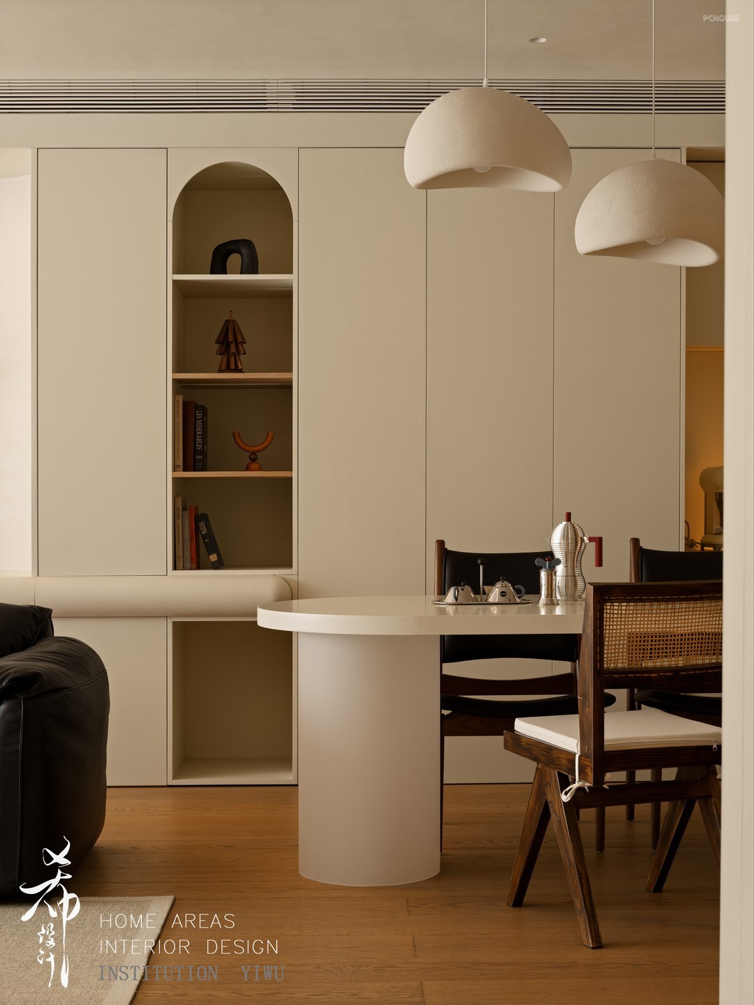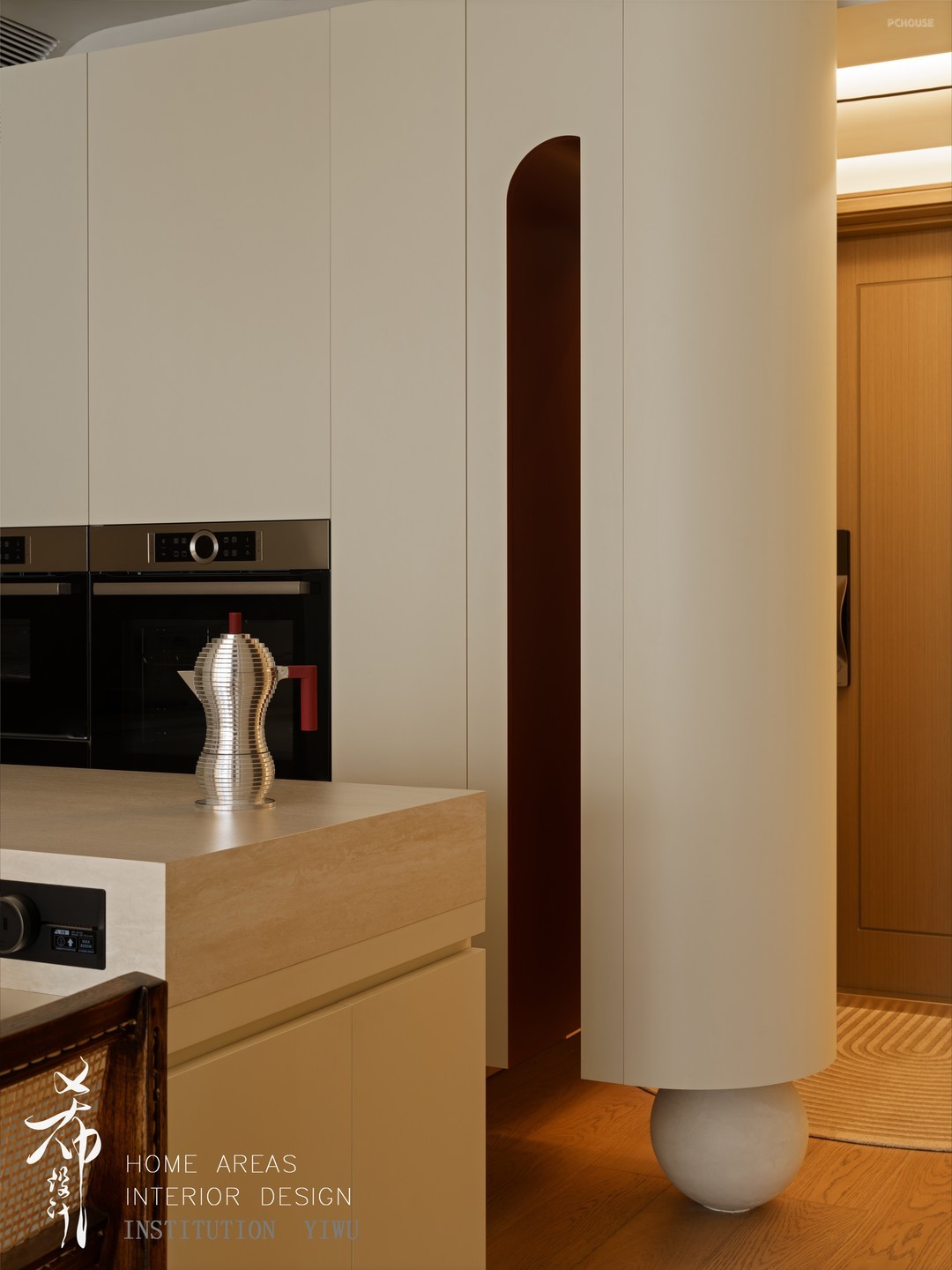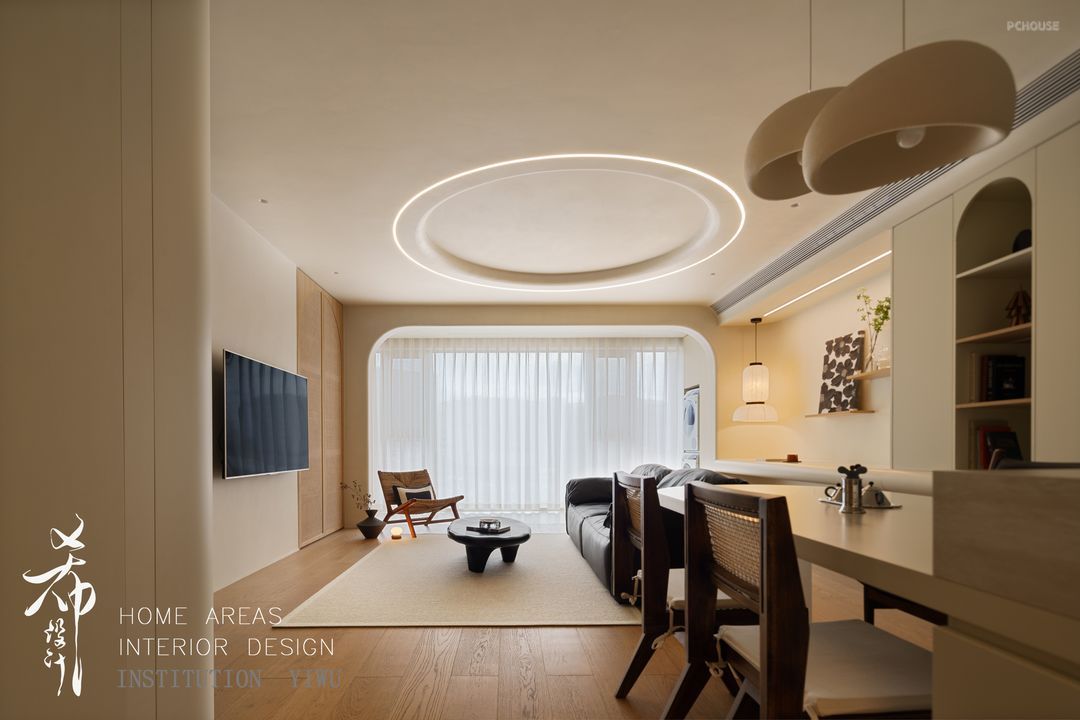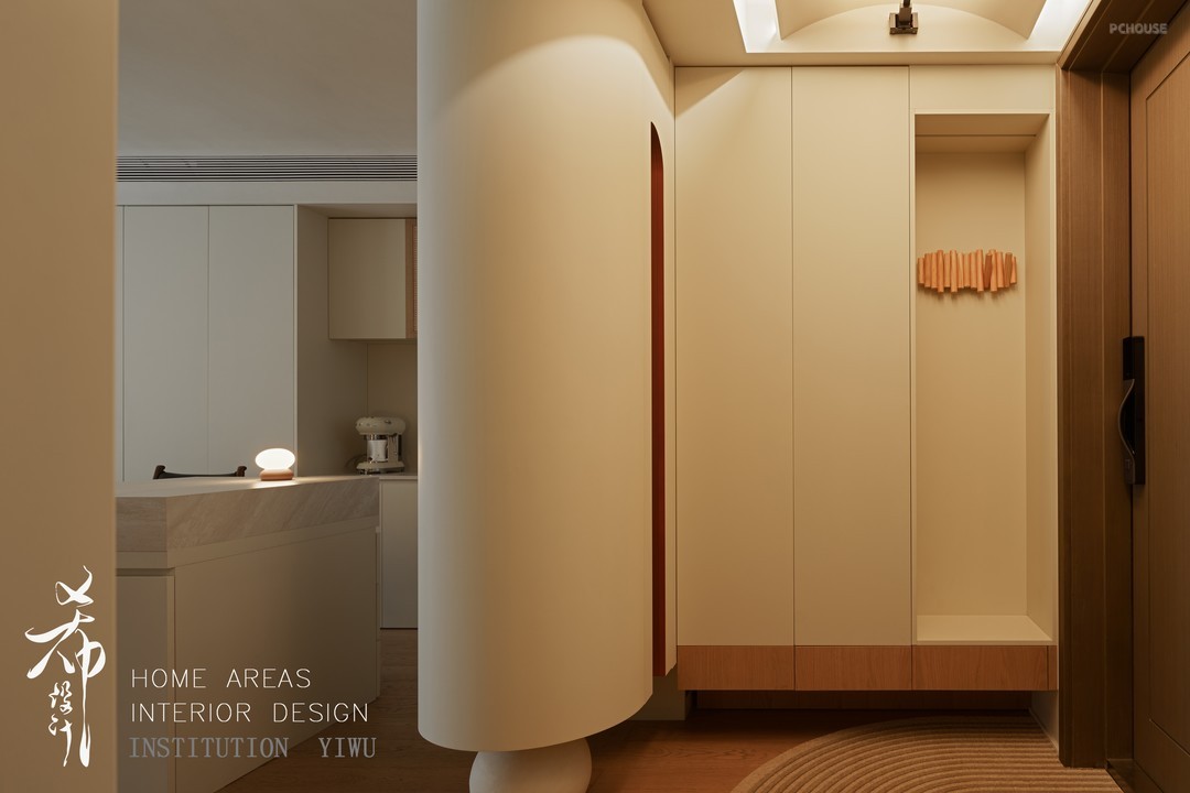 为了避免进门就能看到客餐厅的尴尬,进门区域的悬浮柜体中间部分镂空,底部的球体既是支撑又是造景,多了隐私和采光空间也更加灵动。