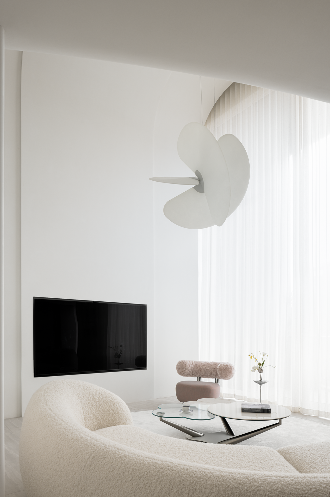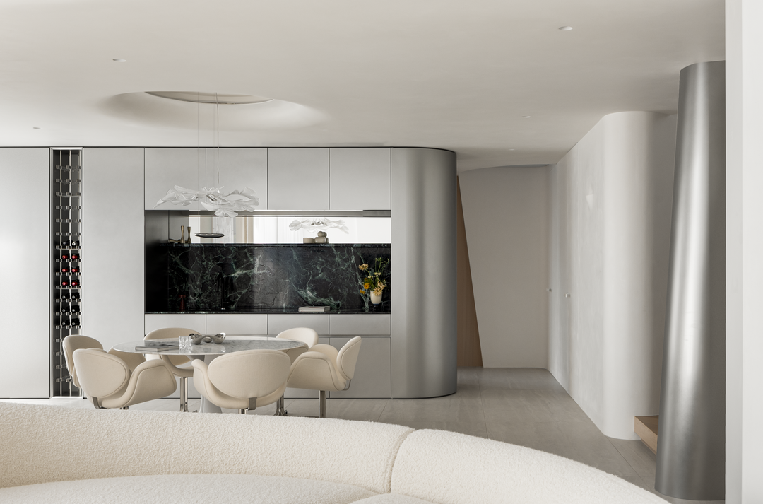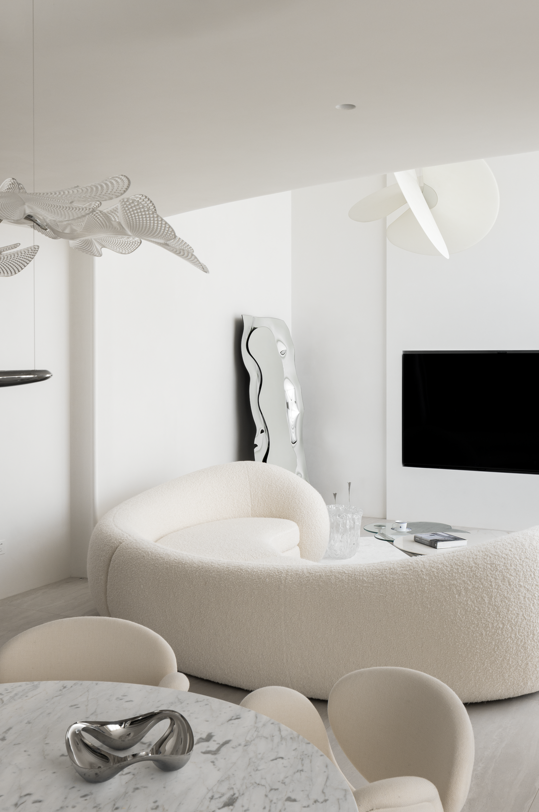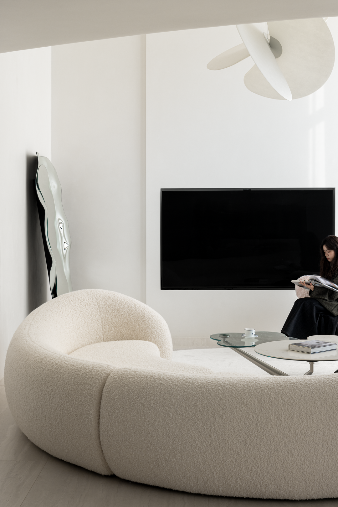 蜿蜒流畅的曲线传达出传达舒缓的感官和自由的空间气息,而引人入境。素简的调性在镜面元素的融入下拉扯延伸,虚实之间逐帧生活影像。