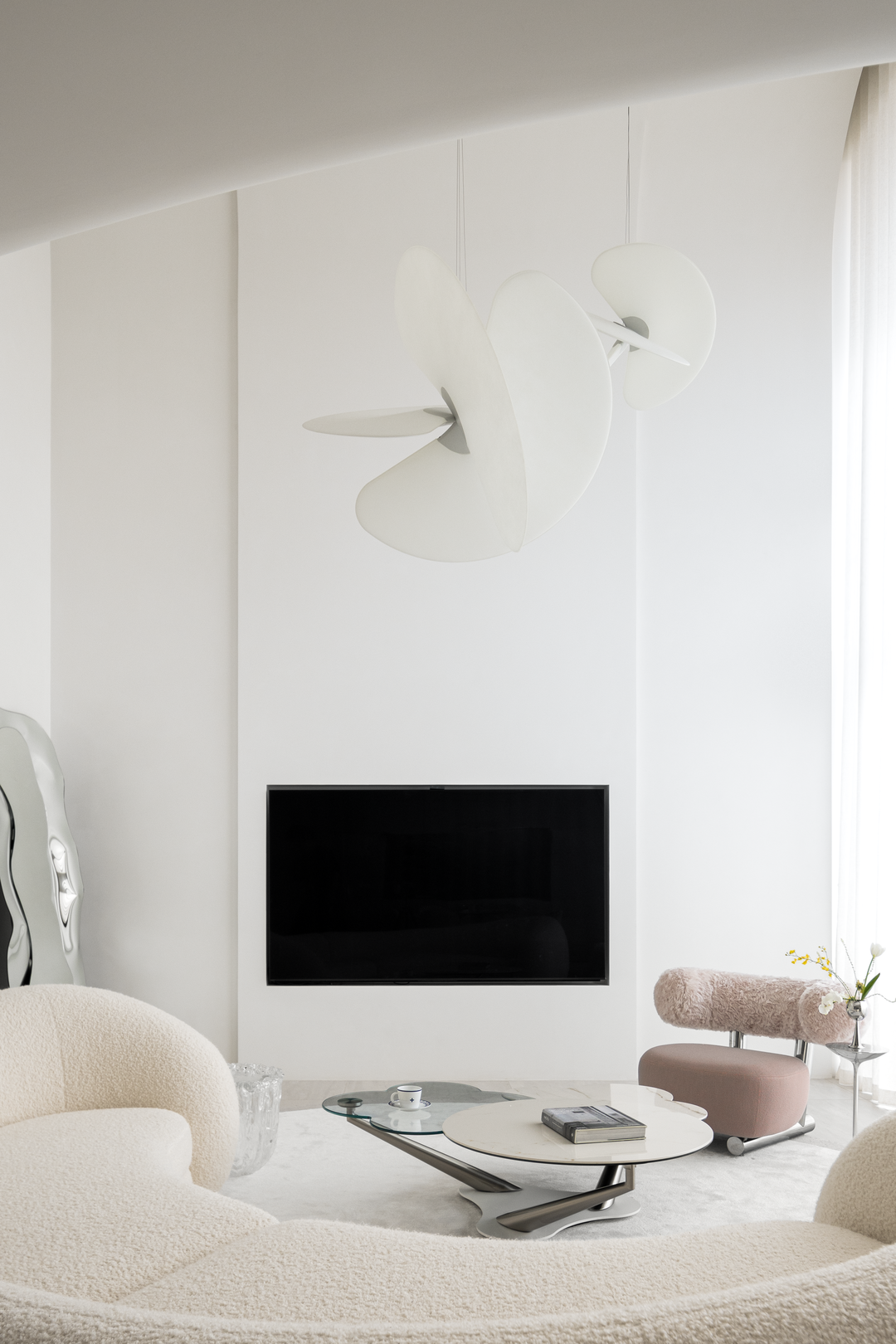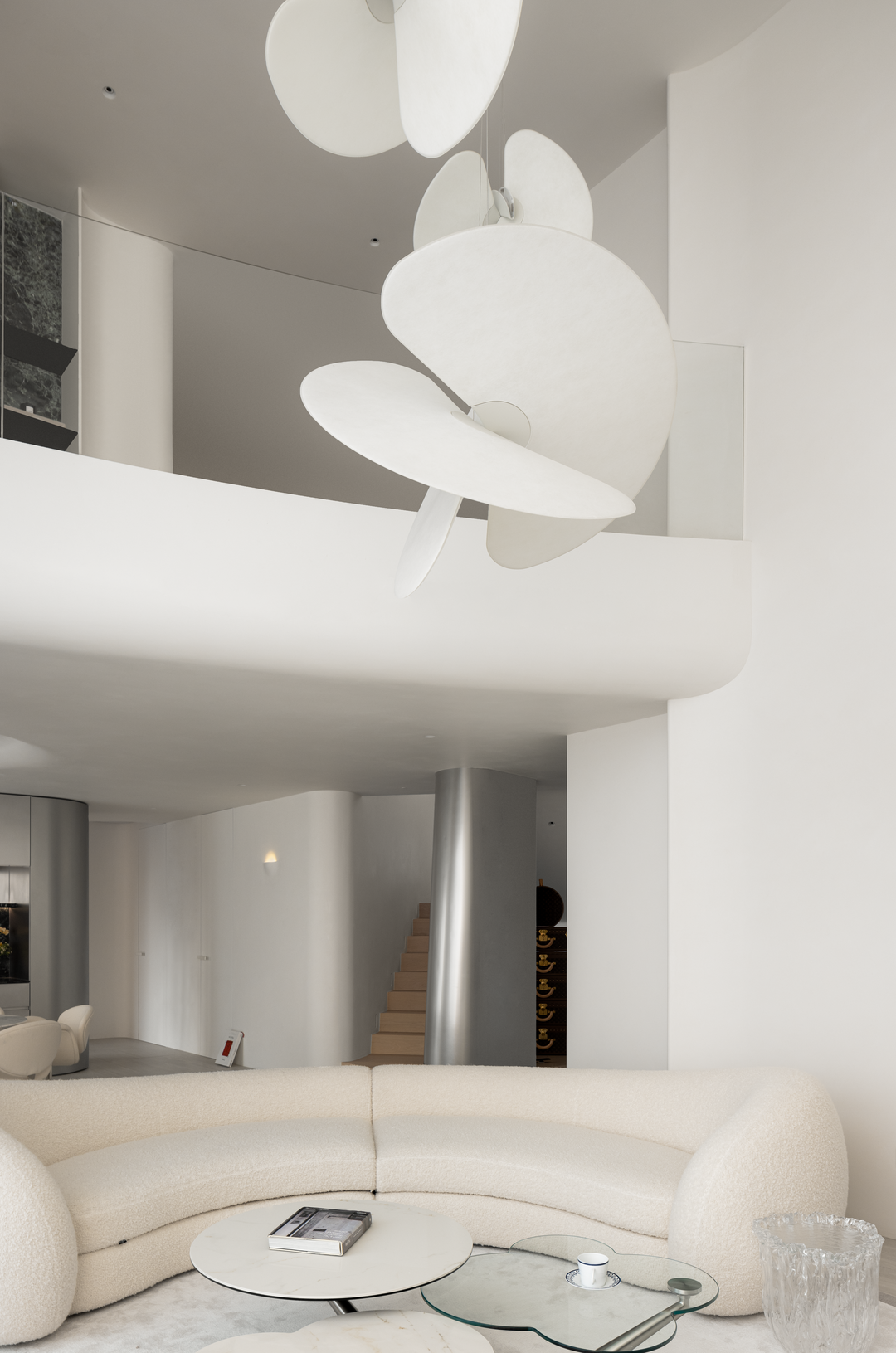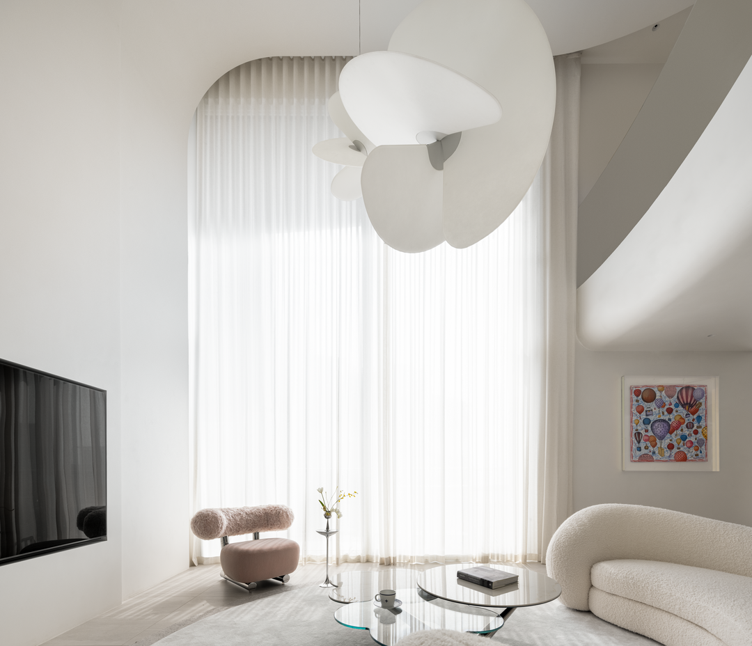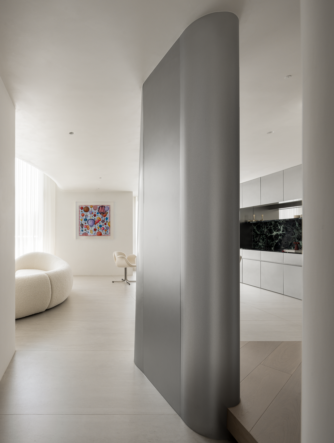蜿蜒流畅的曲线传达出传达舒缓的感官和自由的空间气息,而引人入境。素简的调性在镜面元素的融入下拉扯延伸,虚实之间逐帧生活影像。