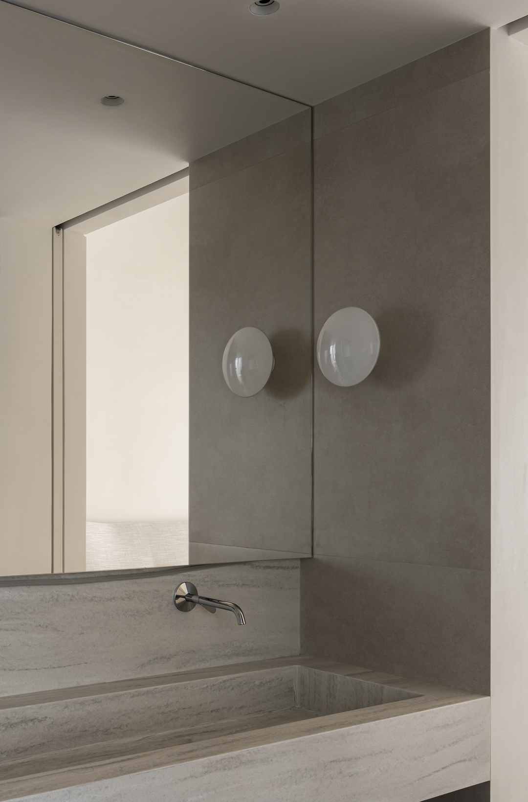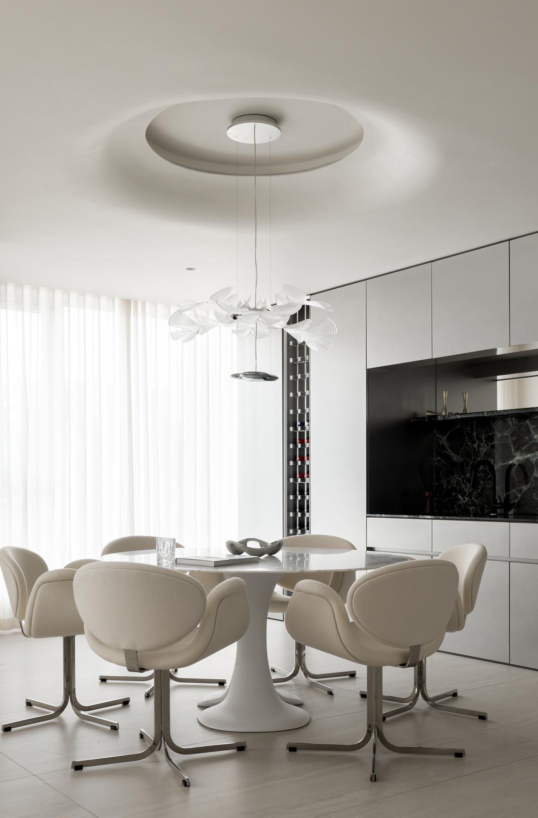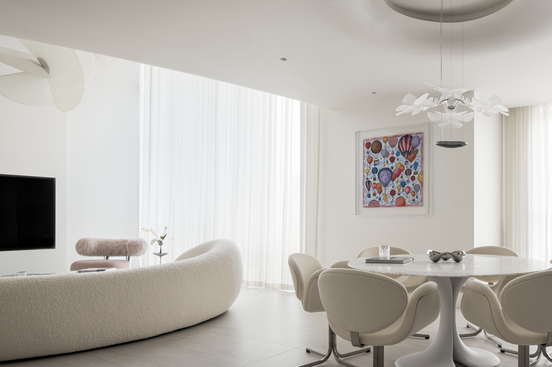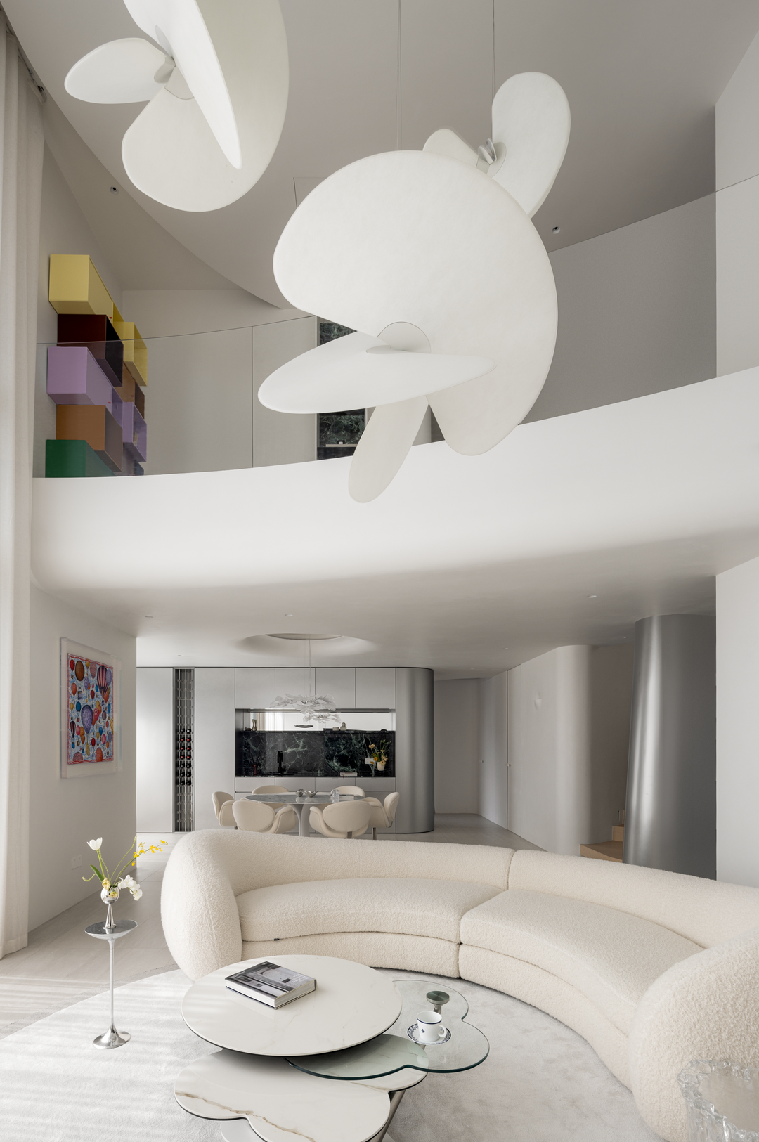 蜿蜒流畅的曲线传达出传达舒缓的感官和自由的空间气息,而引人入境。素简的调性在镜面元素的融入下拉扯延伸,虚实之间逐帧生活影像。