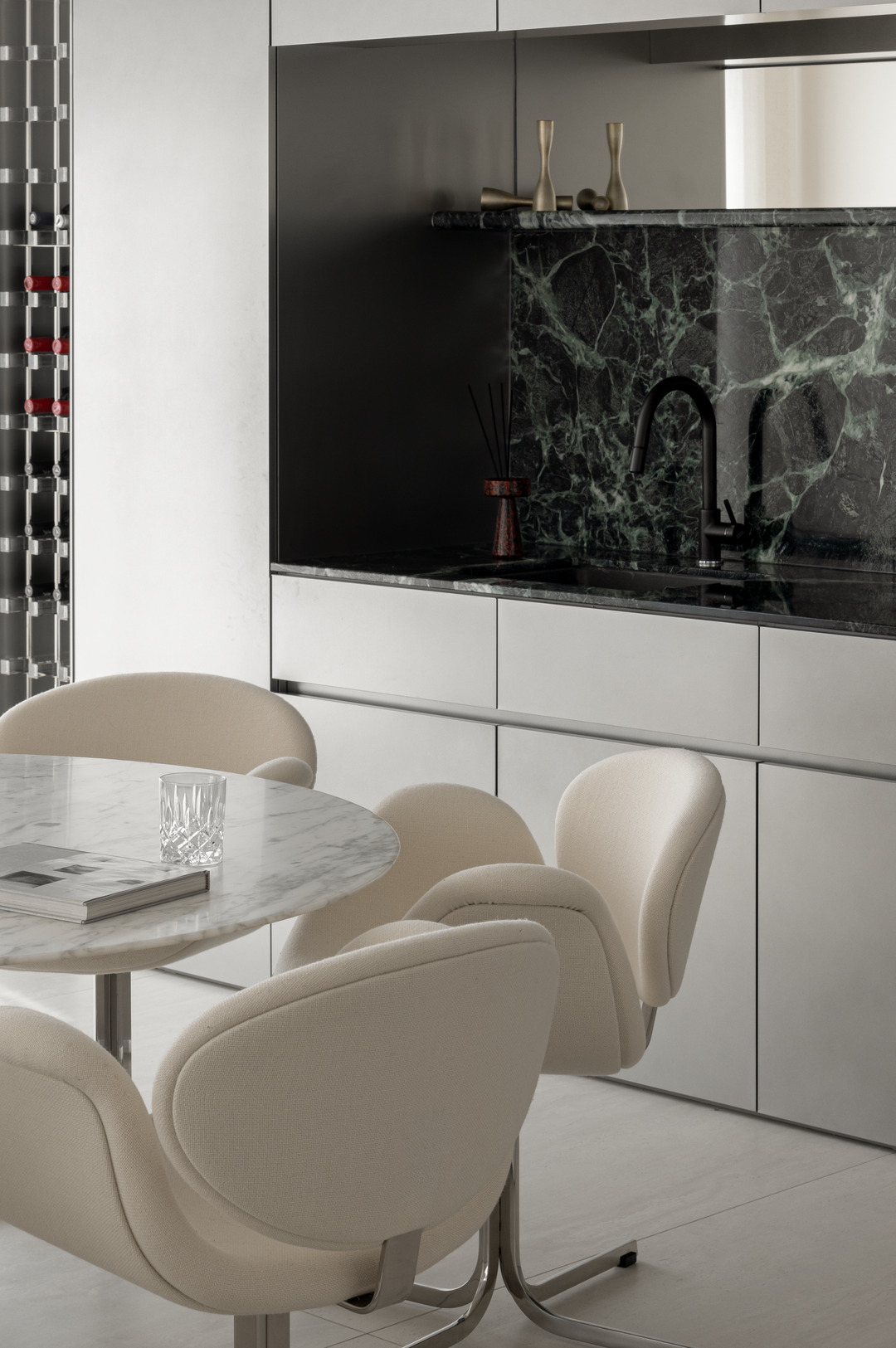 将餐厅的阳台扩进来,做了一排储物空间兼水吧台,材质上以银色不锈钢结合墨绿色Prada大理石,几种材质的混搭让空间呈现出一种现代主义的先锋感。