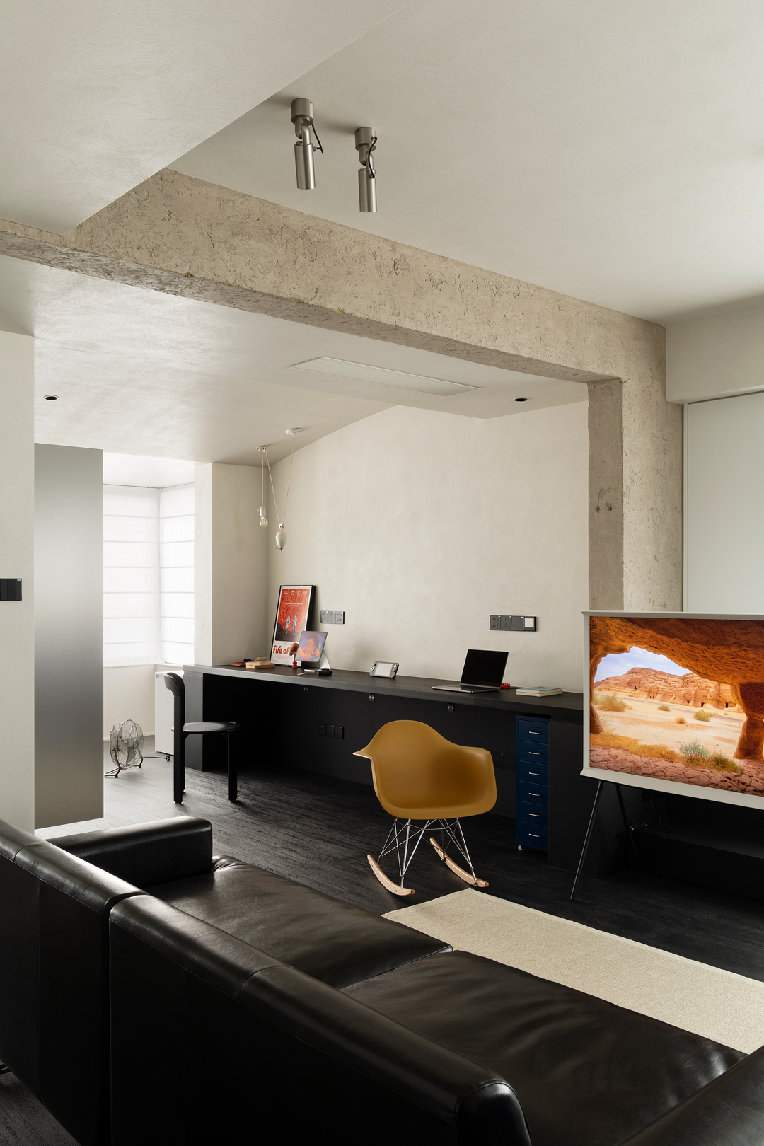 屋主们希望书房与客厅之间的过渡,能有趣好看。我们结合全屋的风格调性,选择将梁体裸露,表面拉毛处理。