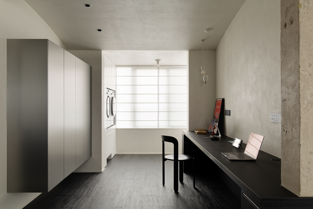 弧形吊顶进一步区分空间,也为简约的空间注入一丝柔和。阳台上一侧做定制柜,嵌入洗衣机与烘干机,另一侧摆放宠物用品。