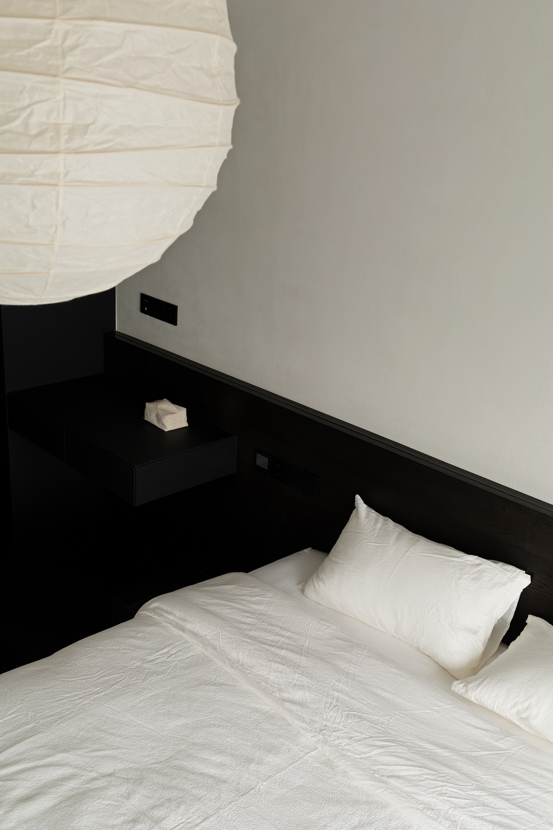 主卧延续公区的色彩与材质搭配,同样,这里也有一个飘窗,如果延续常规布置,空间动线逼仄不便,我们便用地台连接飘窗,将飘窗纳入活动区,空间更有整体感,木地板则提供自然温暖的触感,随心而惬意。
