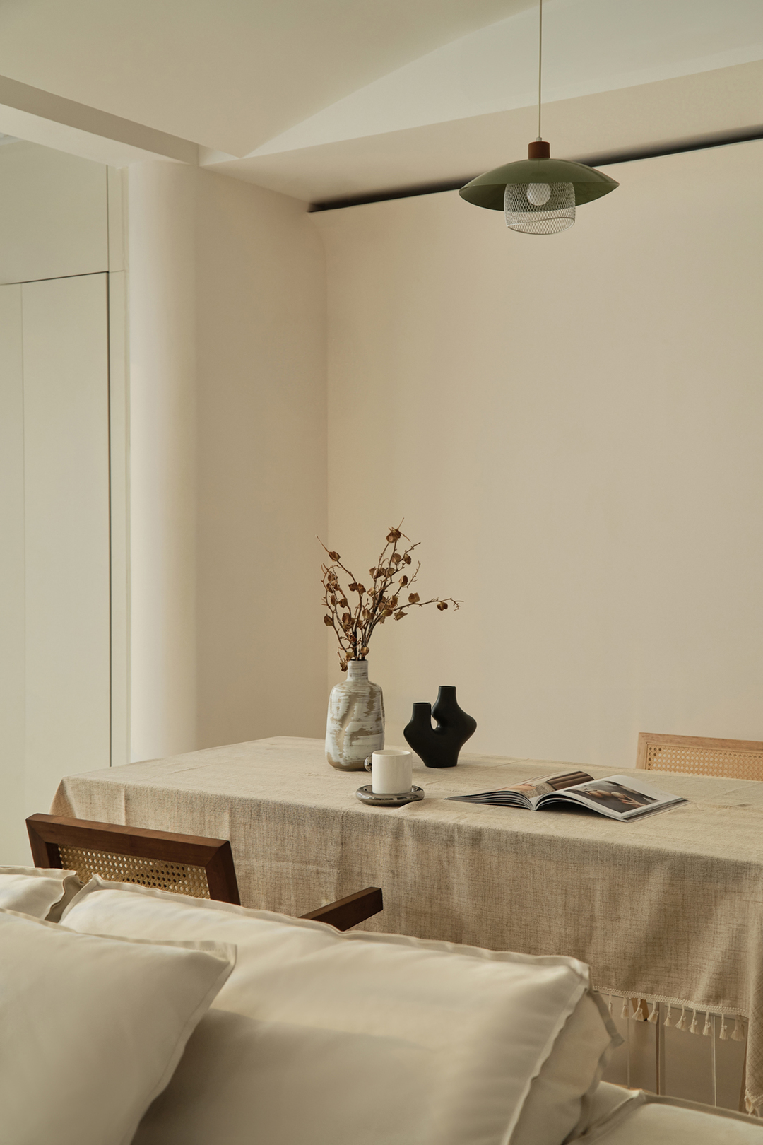 餐厅的墙面也做了弧形的设计,向上延申的弧形和顶面自然过渡