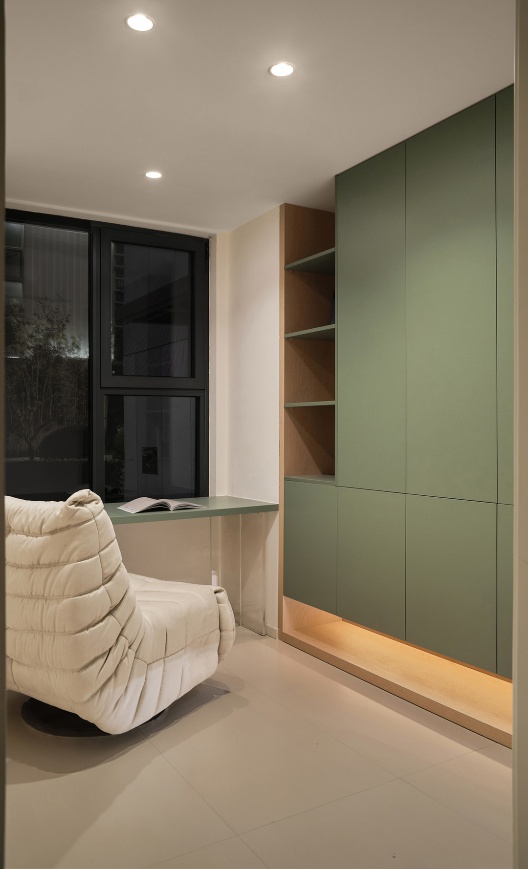 书房将原来的飘窗位置做了改造,设计成了书桌,侧面做了满墙的收纳柜,给其他房间的收纳做补充,柜门选择了和客厅跳色一样的豆沙绿色