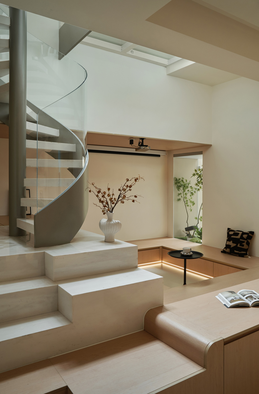 地下室空间,不仅顶面做了玻璃的形式增加采光,侧面靠近天井的位置,也打通做了养绿植的玻璃花池,可以间接的"借"隔壁大采光井的天光,使空间更加敞亮