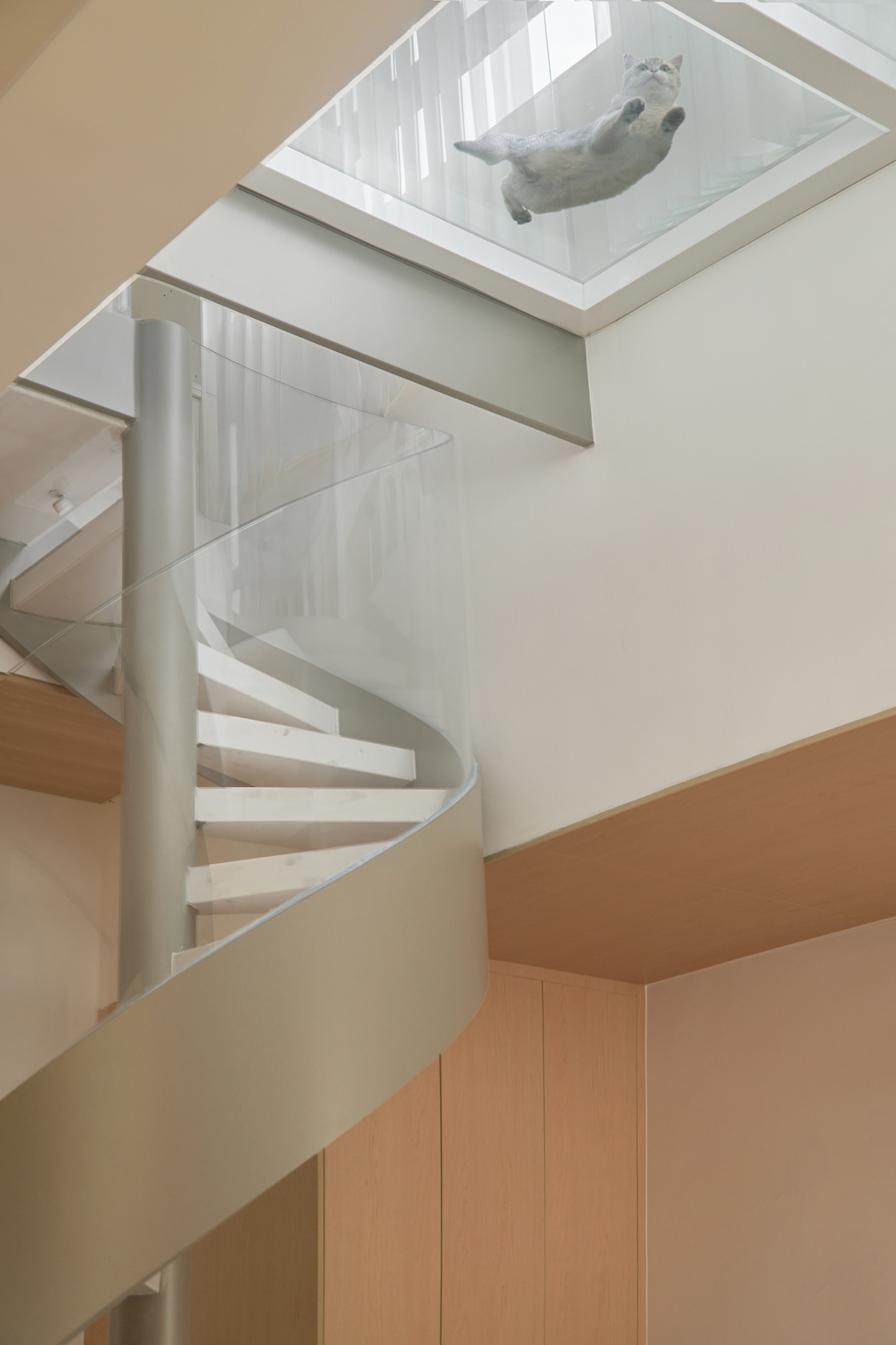 楼梯改造成了迷你的旋转楼梯,踏步的大理石的饰面,扶手做了玻璃扶手,看起来更加通透