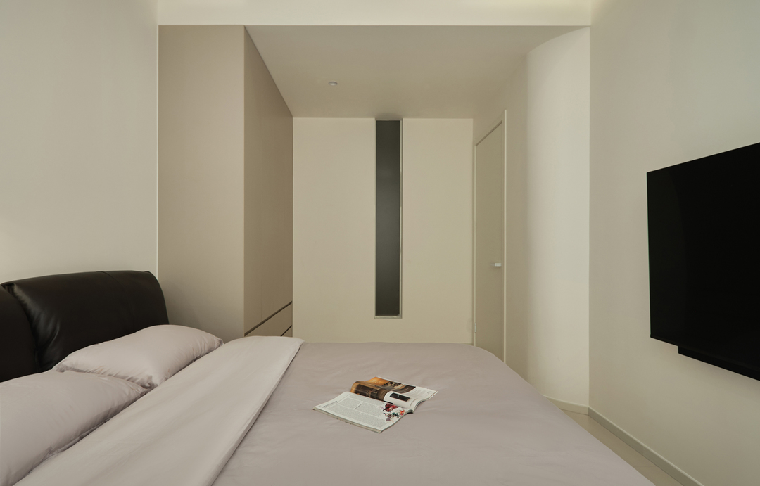 主卧室把床头的方向调转了位置,在床尾处设计了整面墙的柜子组合,飘窗处拆除做了一个小的书桌兼梳妆台