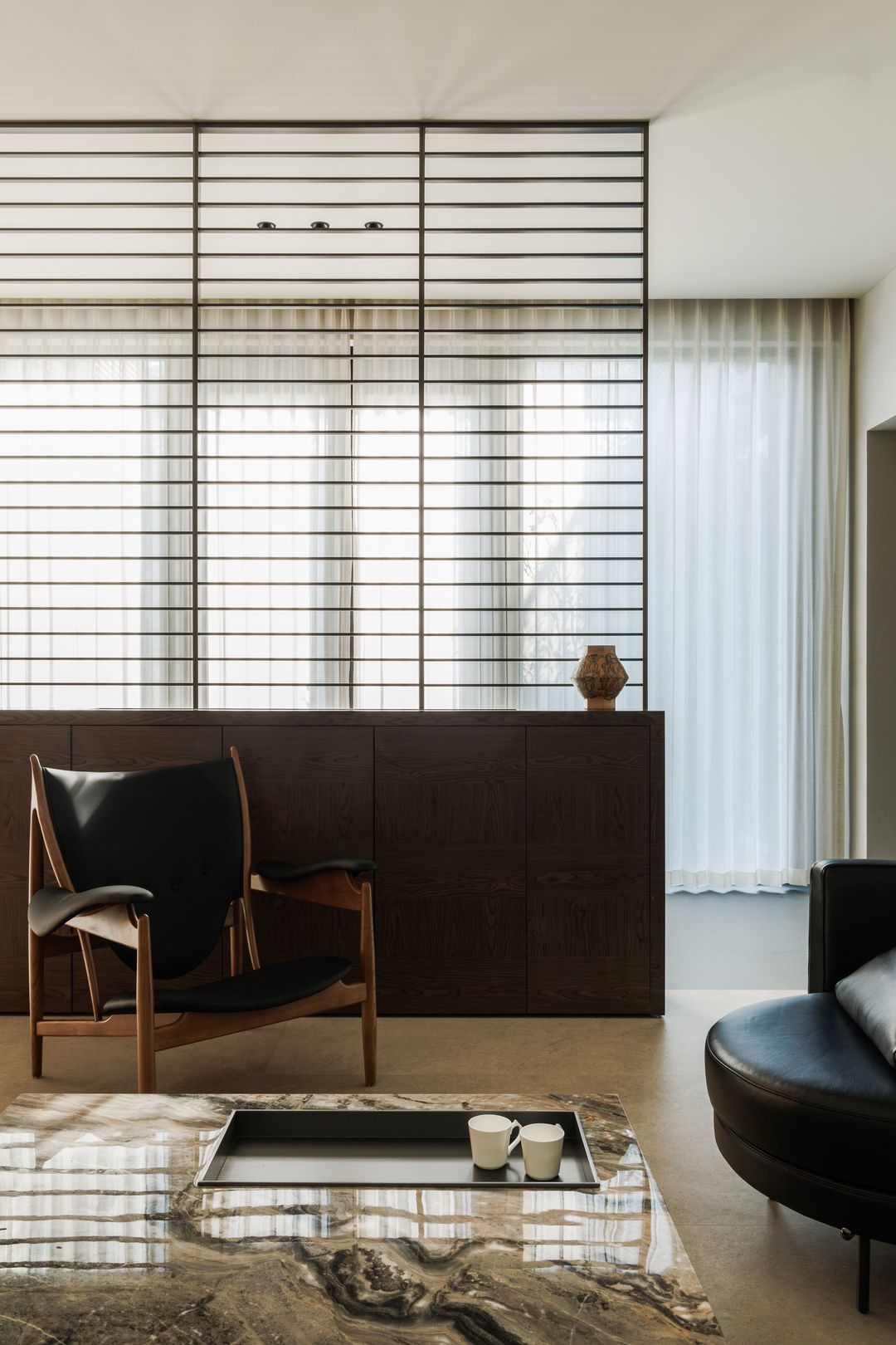 深灰色金属格栅以现代笔触勾勒东方屏风意境,阳光将庭院植物的影子打在纱帘上,层层叠叠是光与影的艺术。