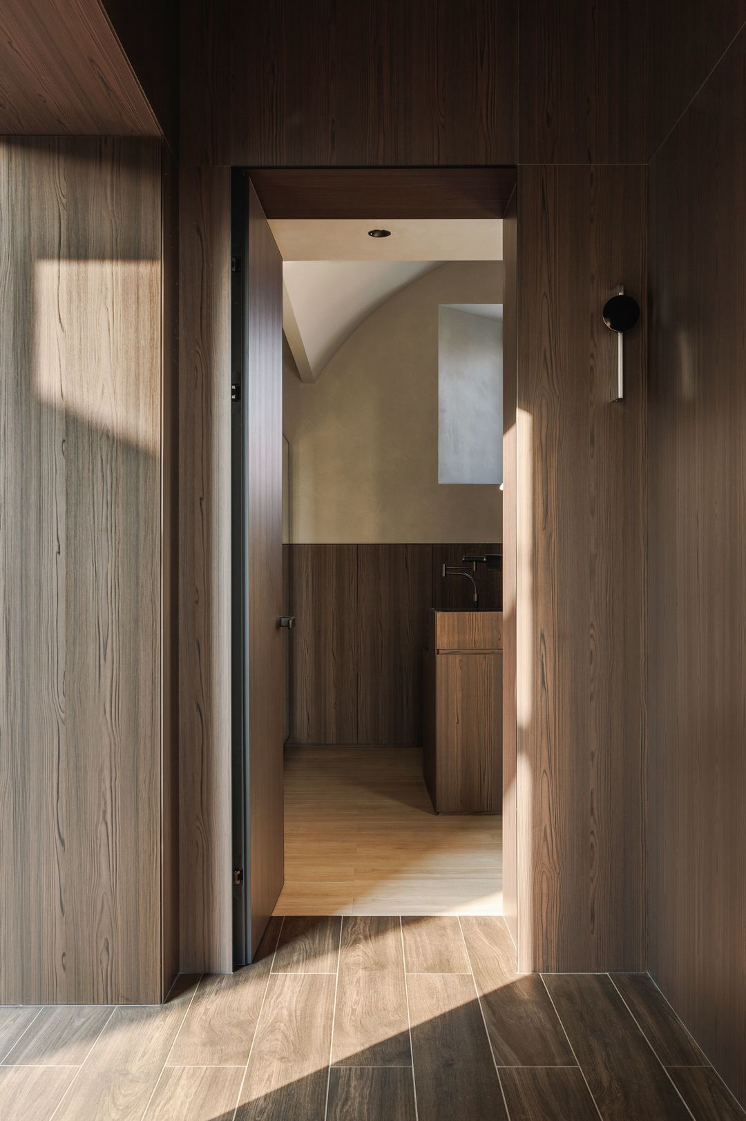 深色木纹砖与同色系木饰墙面共同打造的暗色系卧室玄关,与深色的楼梯空间形成巧妙的色彩呼应,共同构筑出均衡的空间关系,演绎「暗色美学」的深邃诗意。