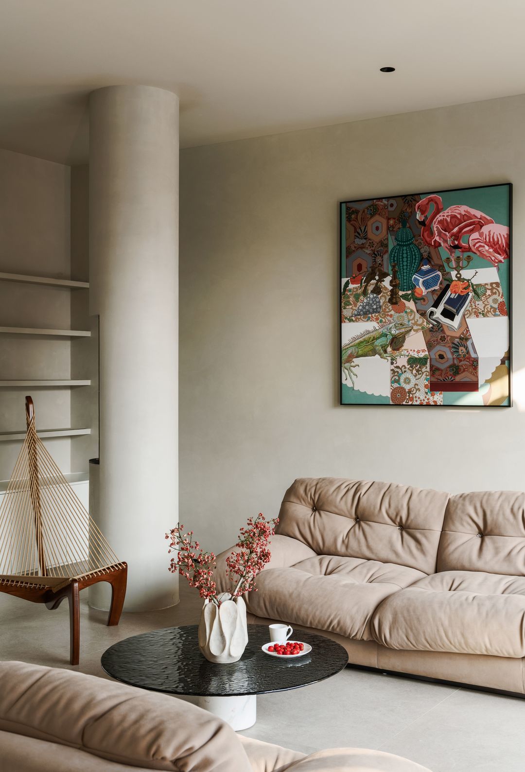 米色艺术漆如丝绸流淌过四壁,亚麻质感地砖泛起暖调微光,构筑极简的纯净画布。异形沙发以流畅曲线解构方正空间,柔软的皮质与冷峻的大理石茶几碰撞,一柔一刚,一方一圆,演绎材质协奏曲。