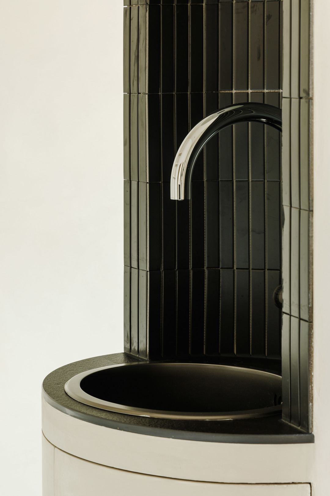 两侧对称的弧形吊顶从墙面自然延伸,如同展开的双翼,将视觉边界推向无限;中央的黑色弧形吊顶则以戏剧性的姿态悬浮,其深邃的色调与两侧的米色形成鲜明对比,营造出如剧院般的仪式感,三重弧形吊顶共同构筑空间韵律。