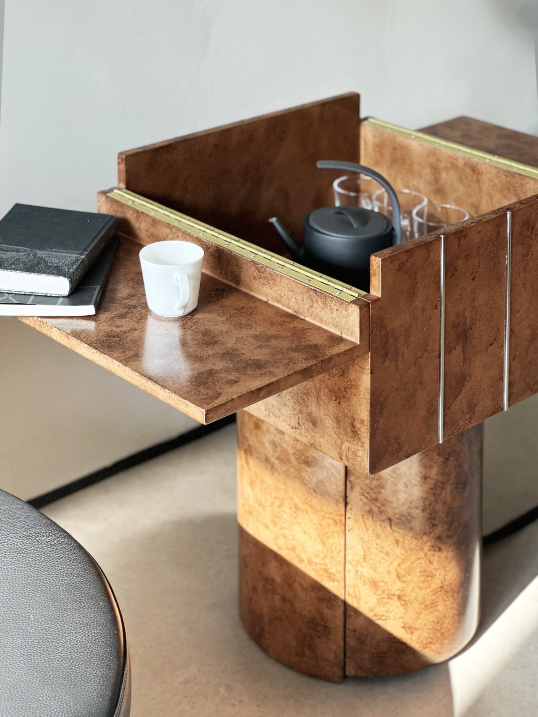 闭合时,方圆几何碰撞,中古木皮包裹做旧金属线条。开启后,隐藏式茶具收纳与延展台面,将东方茶道仪式融入现代生活。