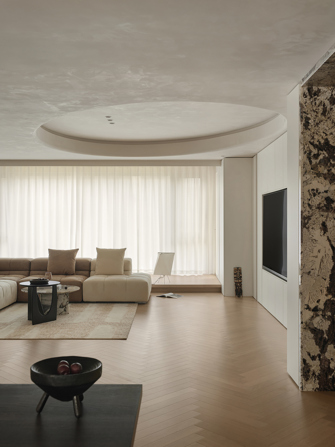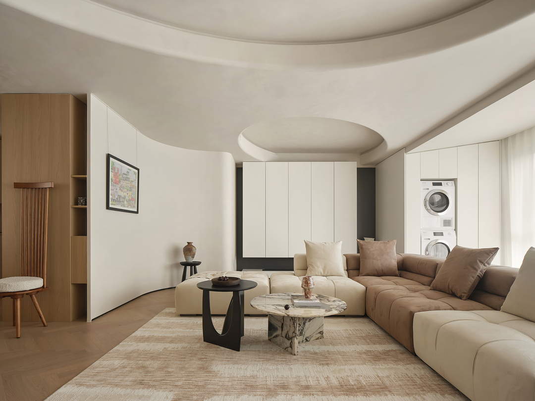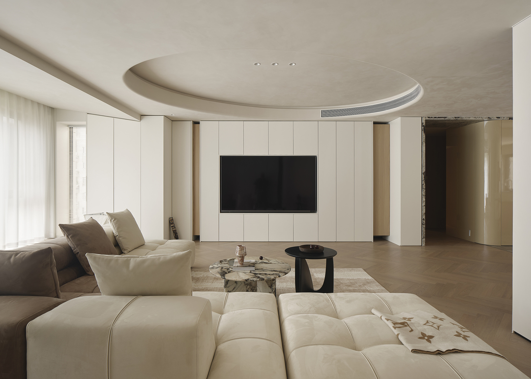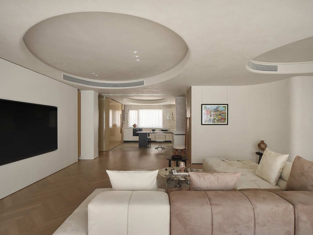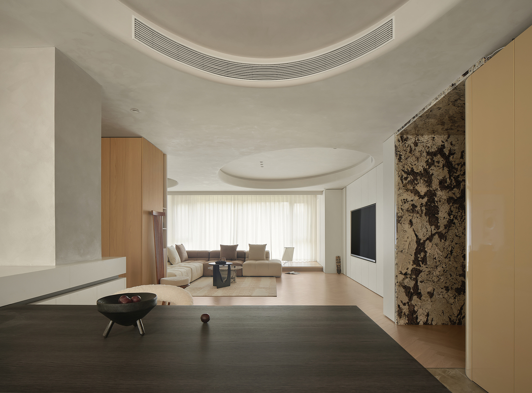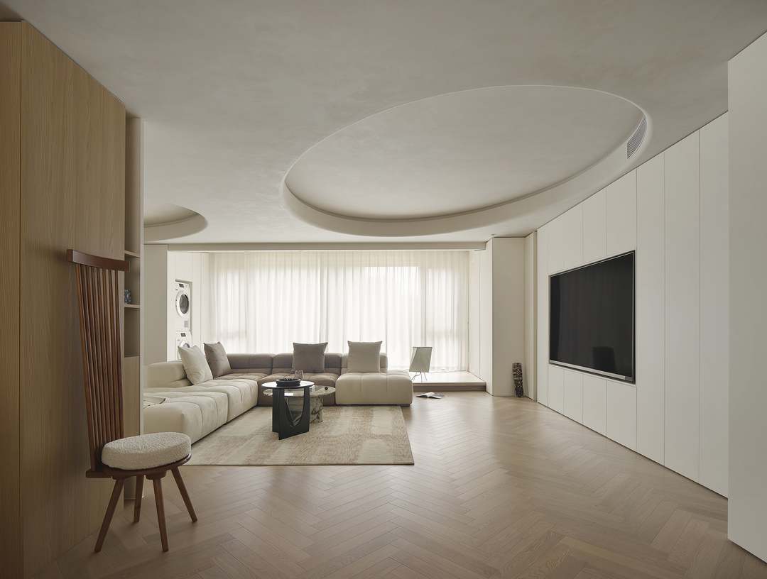 客厅作为家庭的核心,是生活中的一片净土,也是诗意的栖息地。结构与形状交错跳跃,利用统一的色系收拢视觉,简约的基调中,置入灵动的乐趣。