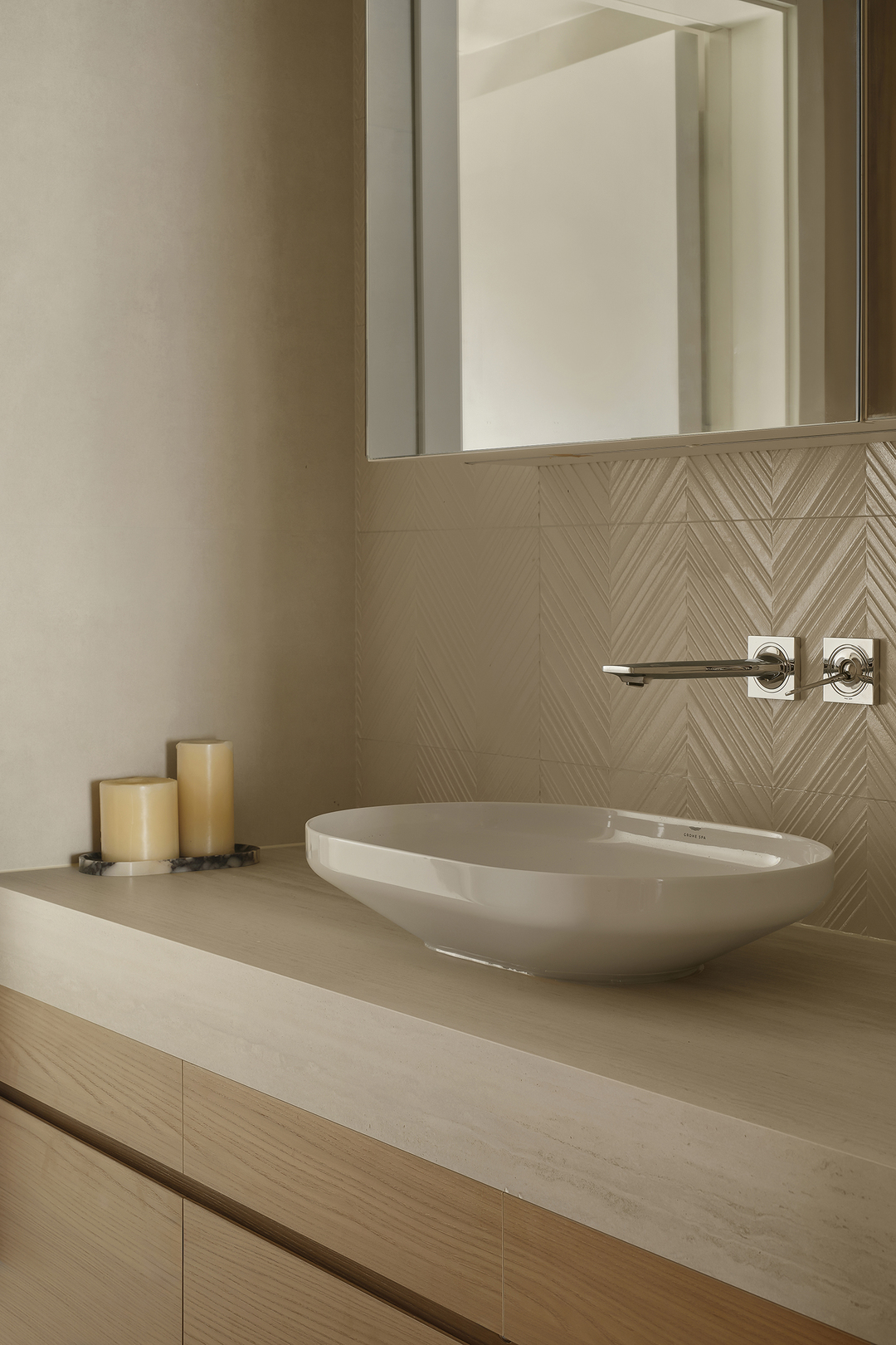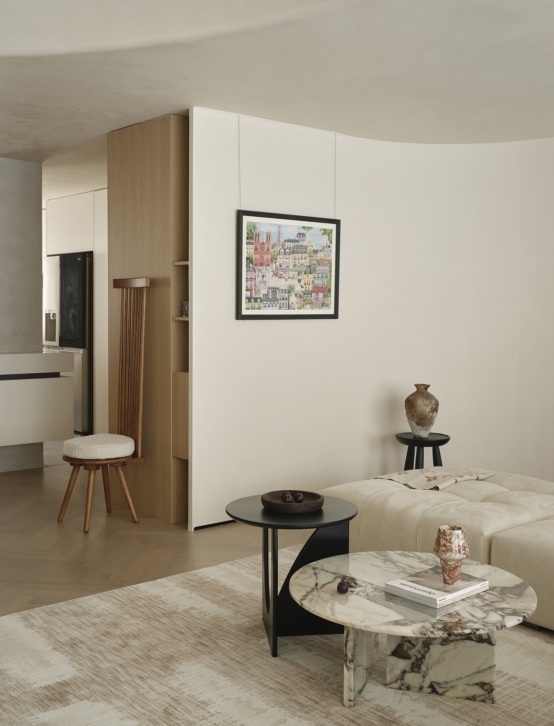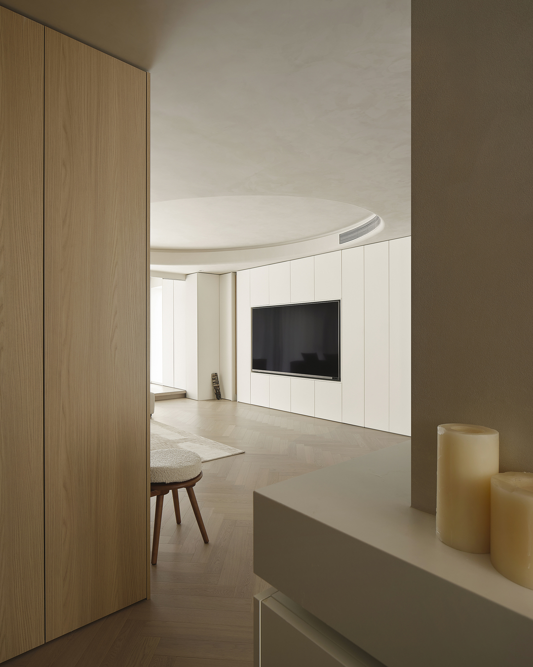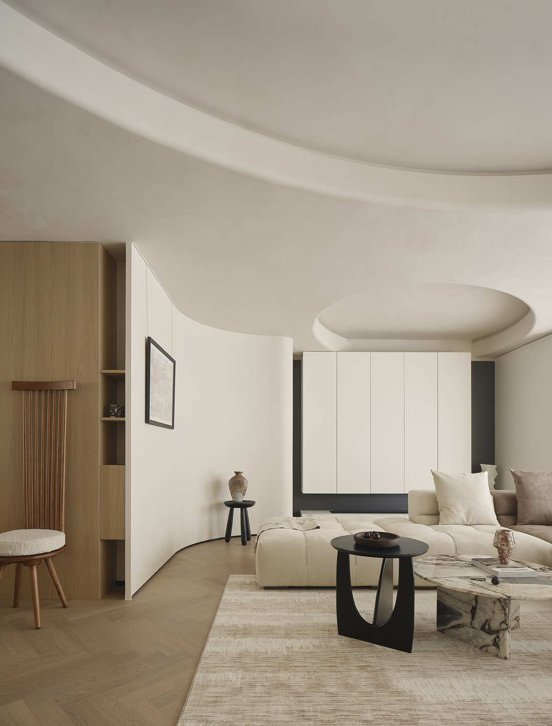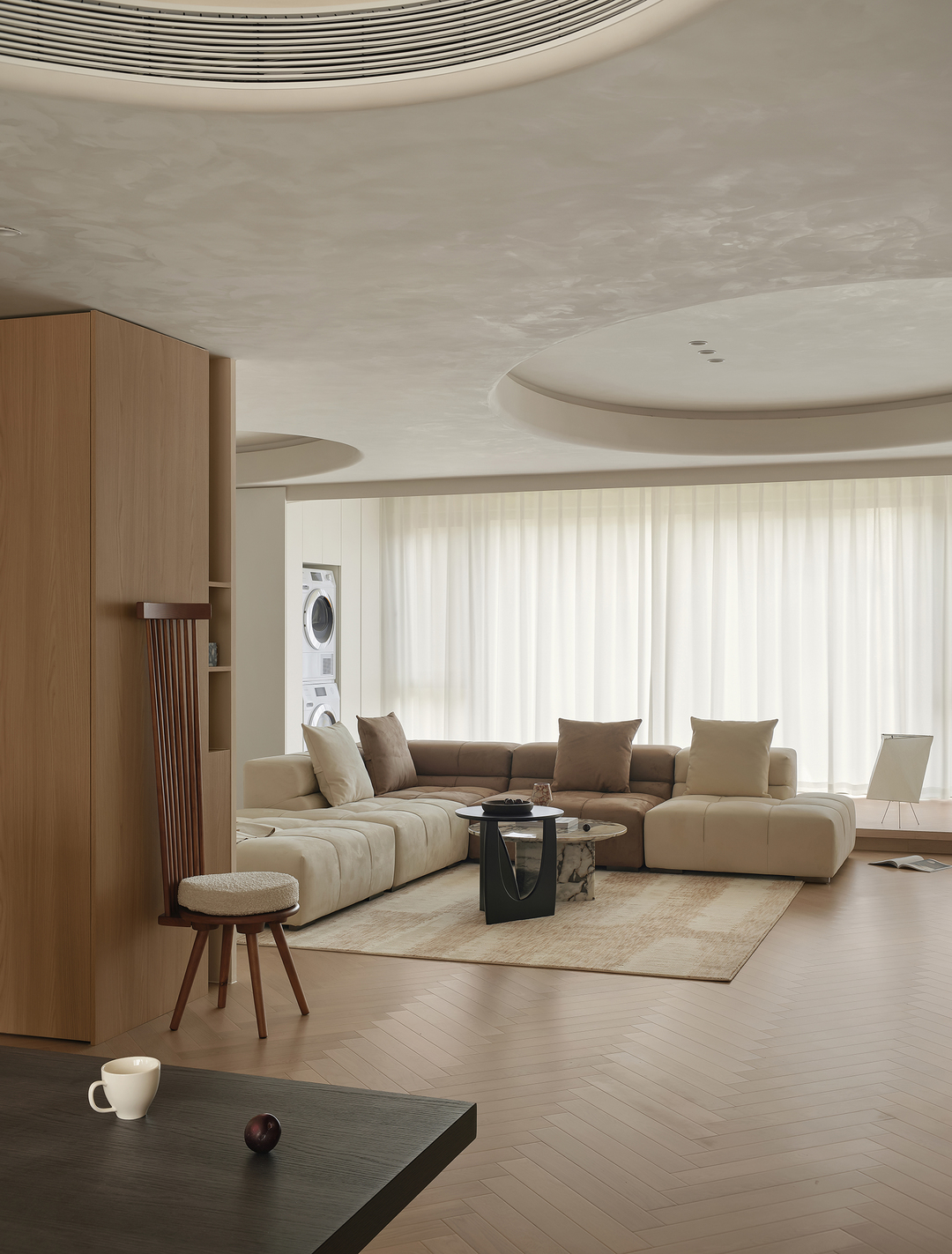 客厅作为家庭的核心,是生活中的一片净土,也是诗意的栖息地。结构与形状交错跳跃,利用统一的色系收拢视觉,简约的基调中,置入灵动的乐趣。