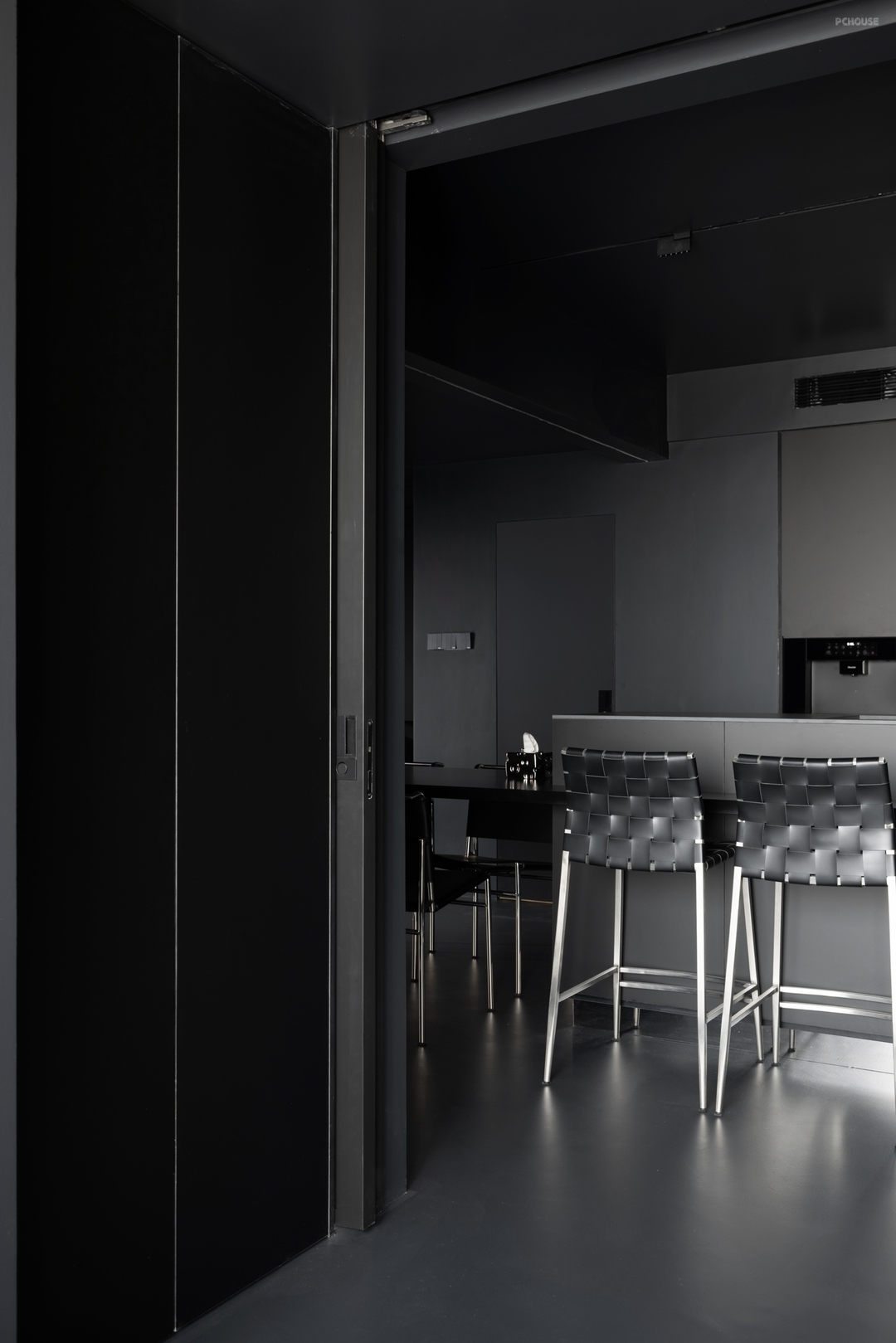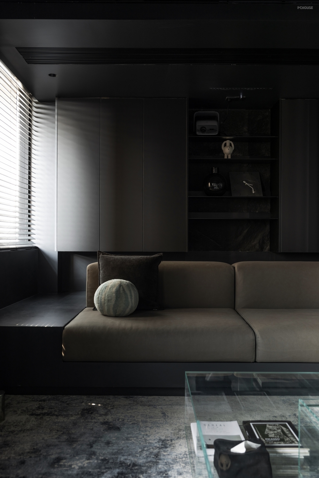 客厅作为整个空间的核心,以纯粹的黑色作为主色调,从墙面、地面到家具,甚至细节装饰,都采用了深浅不一的深色调,将空间的每一寸都沉浸在了深的夜色之中。