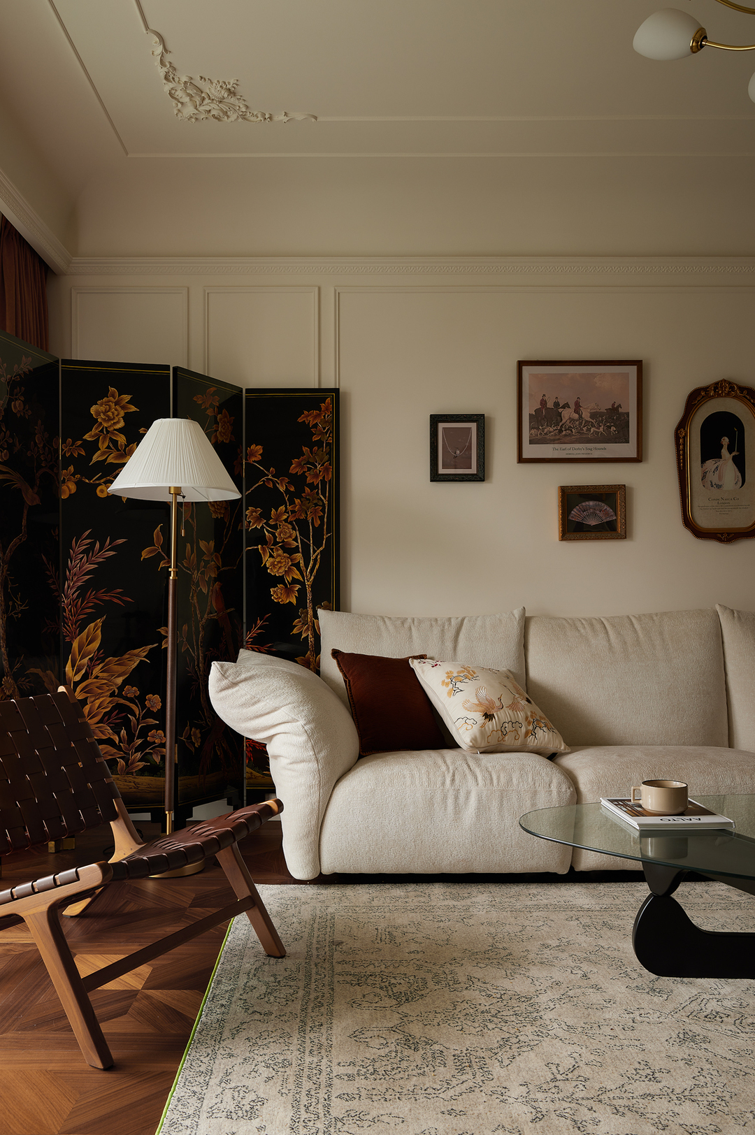 客厅选用图案繁复的屏风作为沙发的背景板,打造出庄严感。欧洲法式的优雅与古典,同东方传统文化的温馨、典雅相结合,中西文化的碰撞,总能产生一种别样的韵味,令人沉醉。