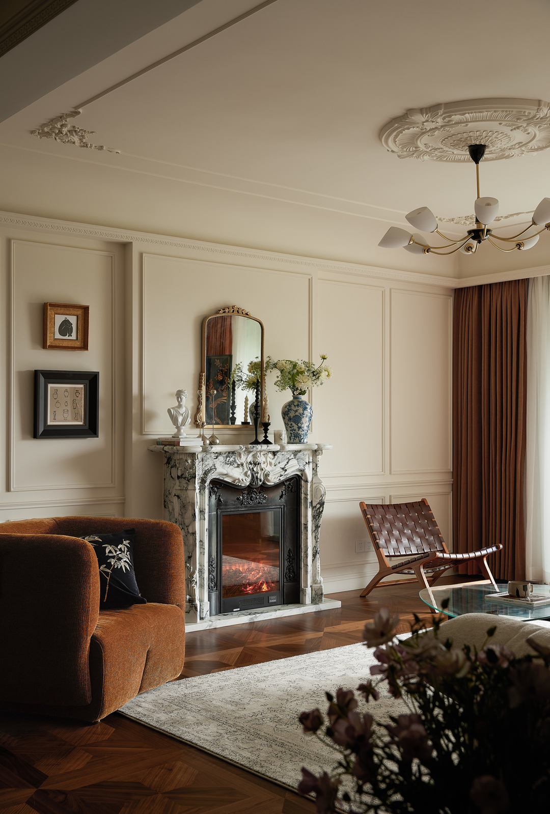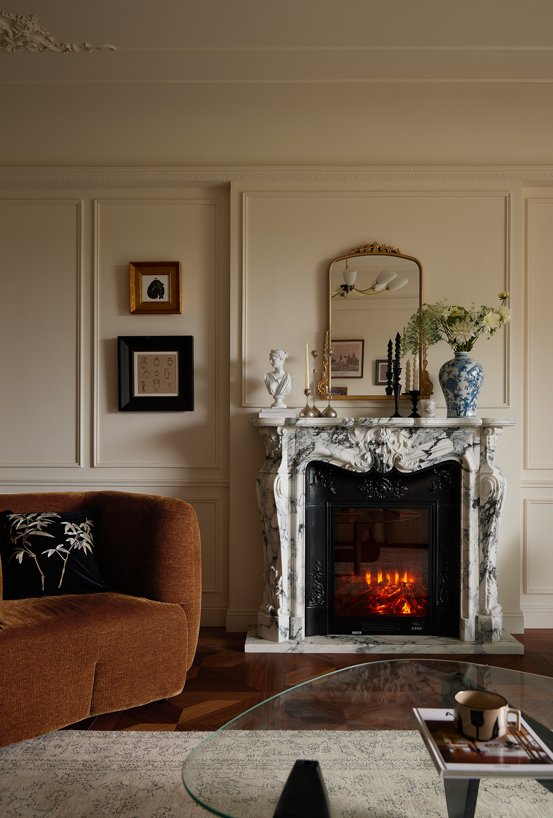 An ornate inked marble fireplace contrasts with a black cast-iron stove. A traditional mirror leans on the mantelpiece, classical vases extend the decoration of the fireplace, and Chinese and Western forms are once again intertwined in the space.