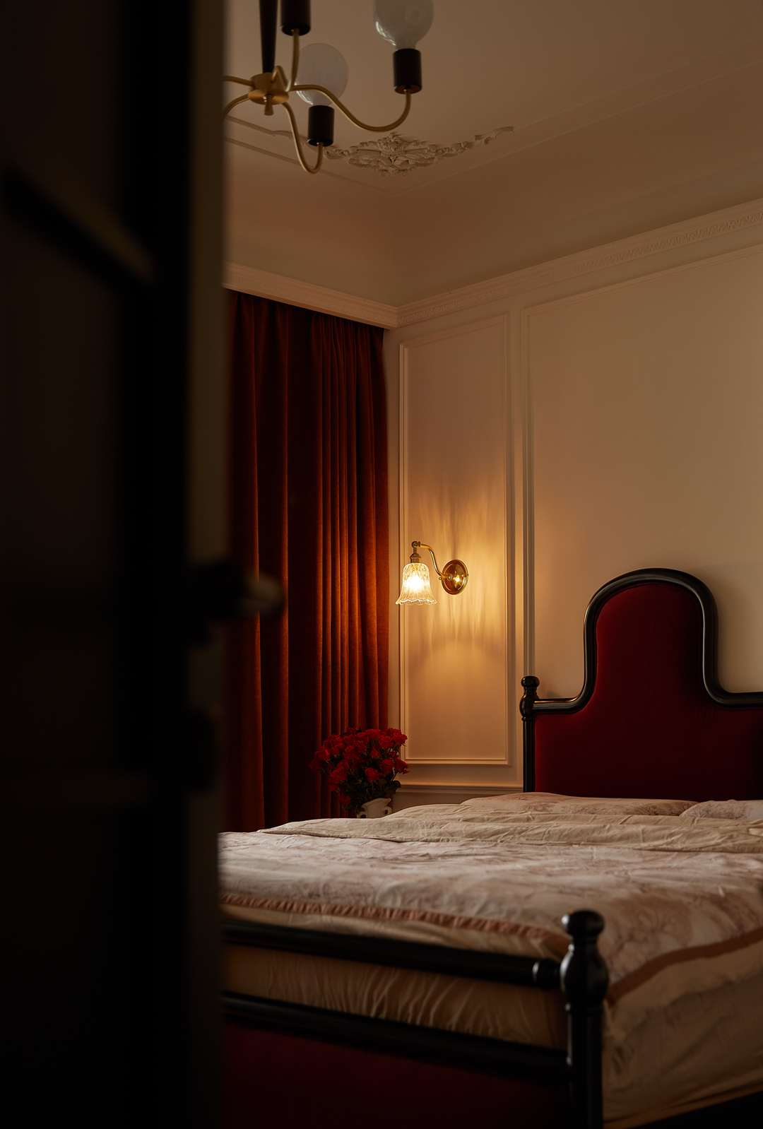 The antique red velvet headboard and curtains have a strong court color, and the elegant style carries the real simplicity and original elegance.