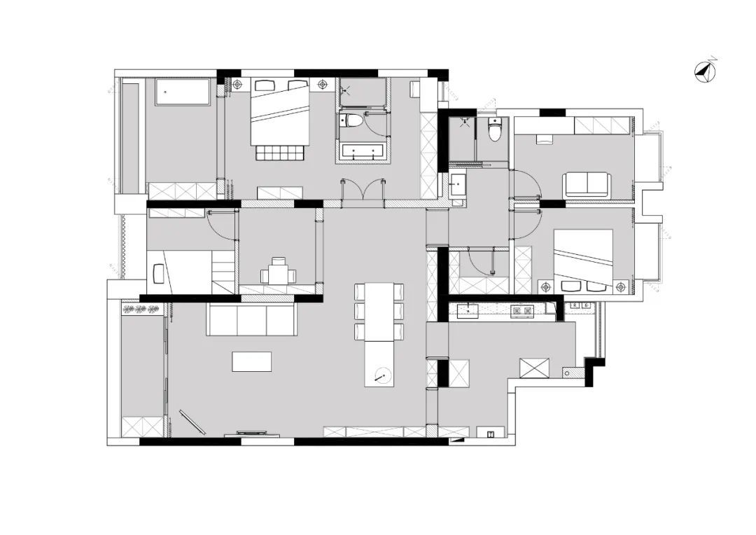 设计优化:1. 厨房入口改向,扩展入户处的空间感;2. 拆除厨房墙体,打造为开放式接入客餐厅,空间更开阔,功能性丰富;3. 餐岛一体提供丰富的就餐空间,并自然过渡餐厨,岛台避免了厨房直面客厅的尴尬局面;4. 主卧改变浴室入口朝向,避免浴室直面门口,保留了主卧年空间的隐私性;5. 主卧将浴缸放置阳台,充分利用阳台的休闲功能,释放了浴室空间。