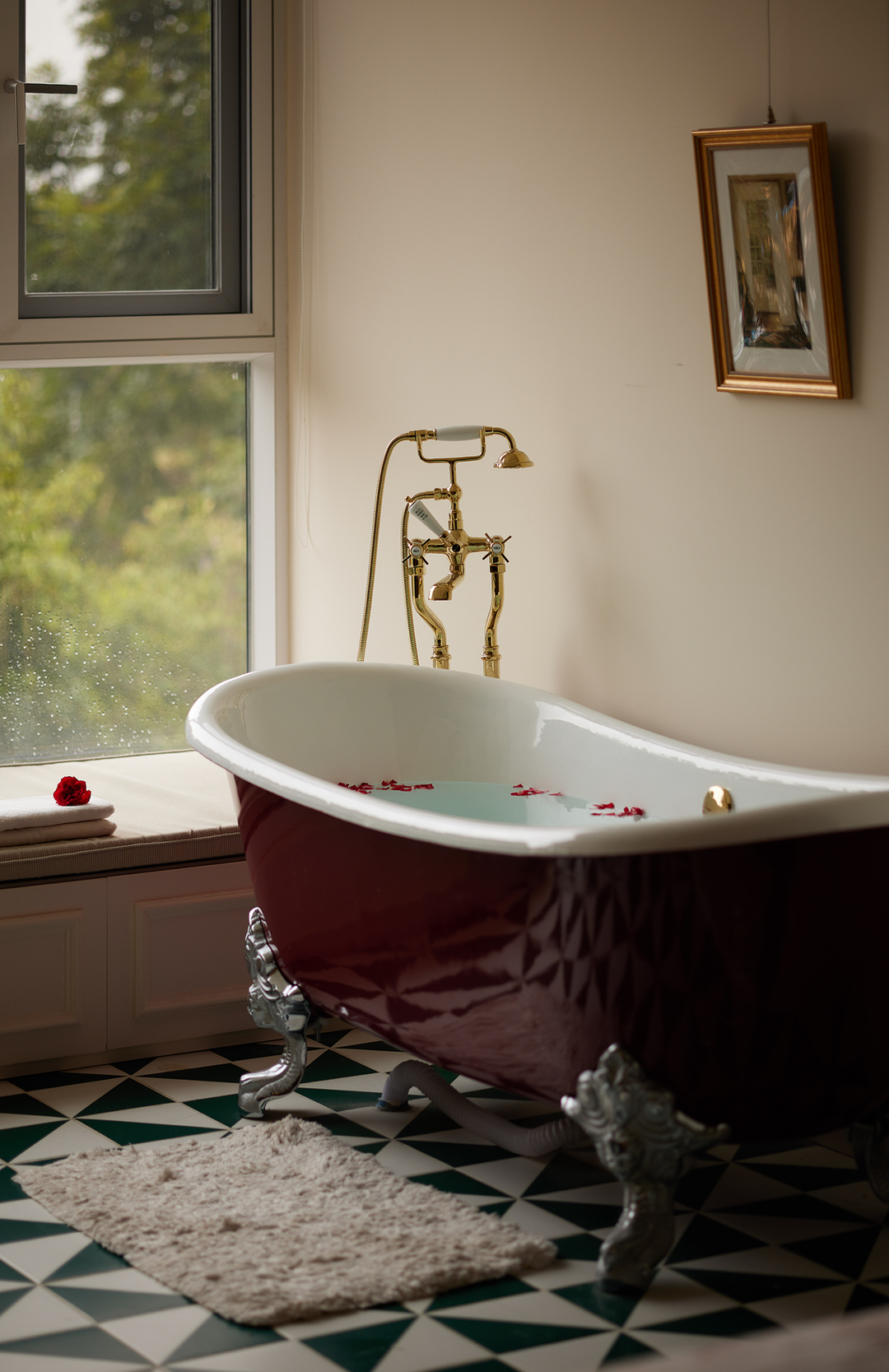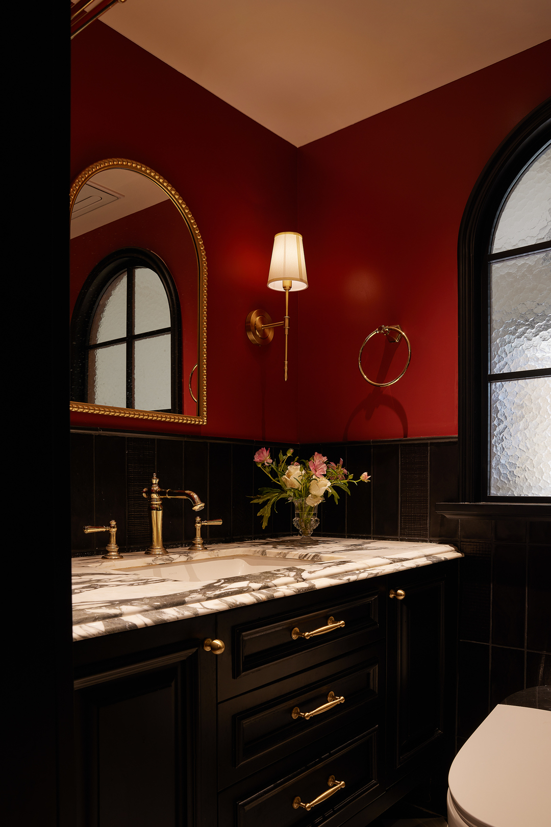 主卧内的浴室倾情演绎《红与黑》,热烈红与沉静黑相互碰撞,大理石与黄铜的触感与丰富的面料结合,阐述了优雅的生活的日常。