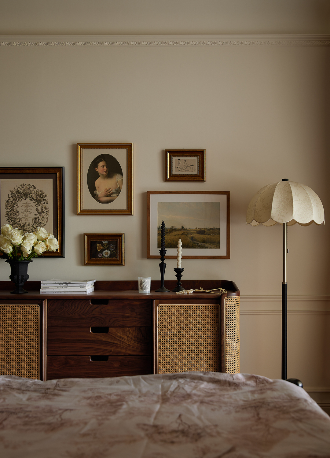 编织斗柜与铃兰花壁灯抒发对理想世界的热烈追求,室内营造一种可诗可梦的氛围,用法式的优雅和慵懒,开启一场绮丽的梦,安放生活的诗意和疲惫。