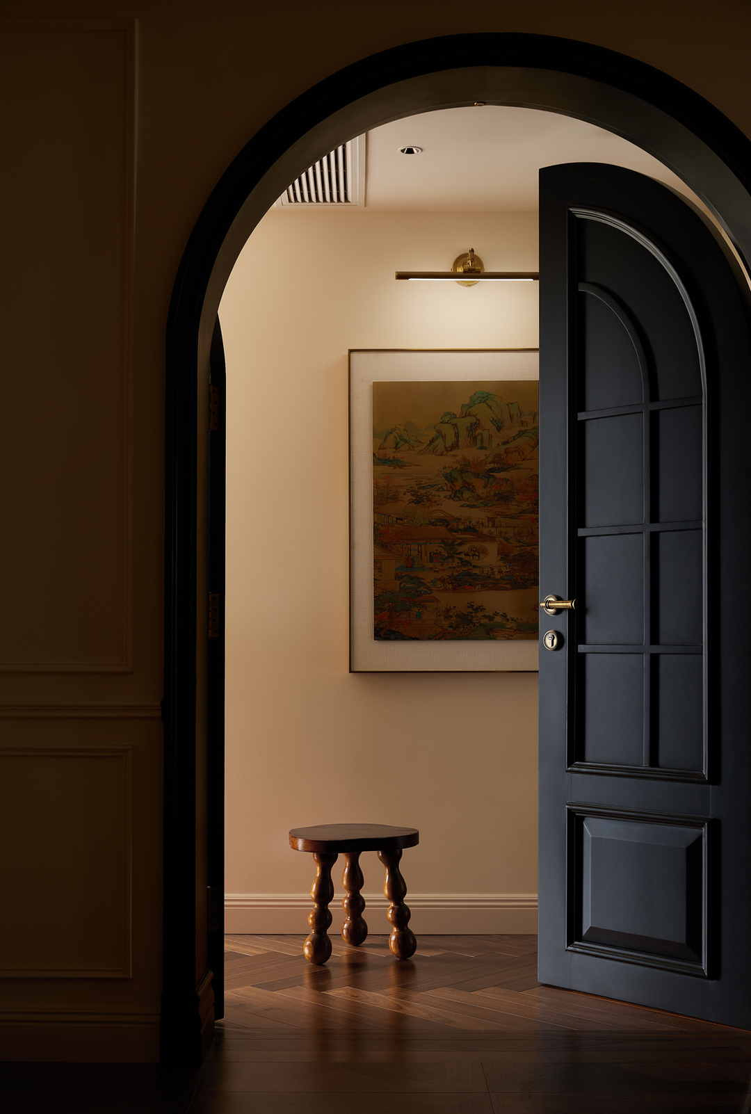 法式的仪式感同样来自这一扇双开门,推开后,入目处所见一副国画,进一步延伸了西式形与中式意。这面墙恰好隔绝了外部视线,保留了空间的隐私性。