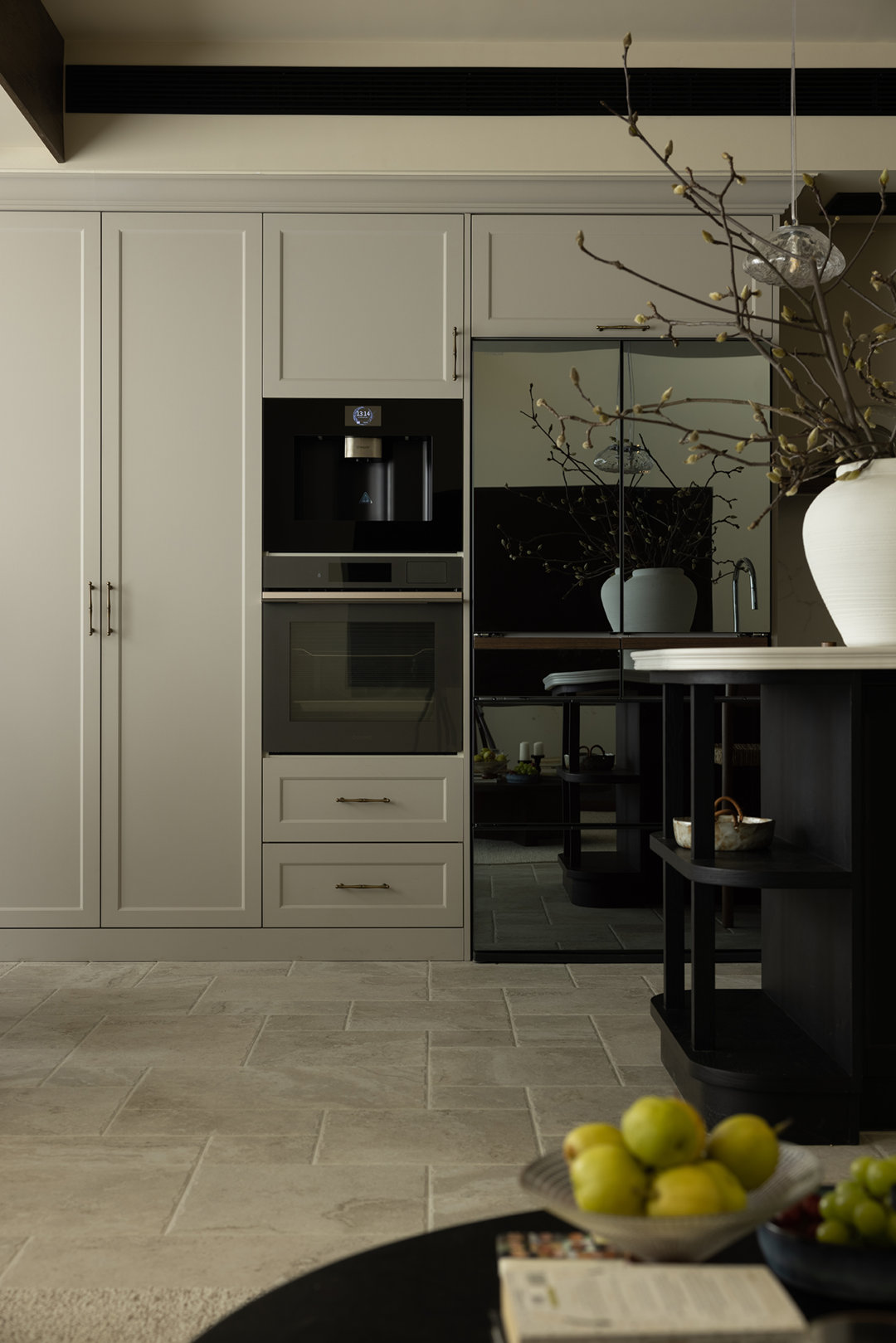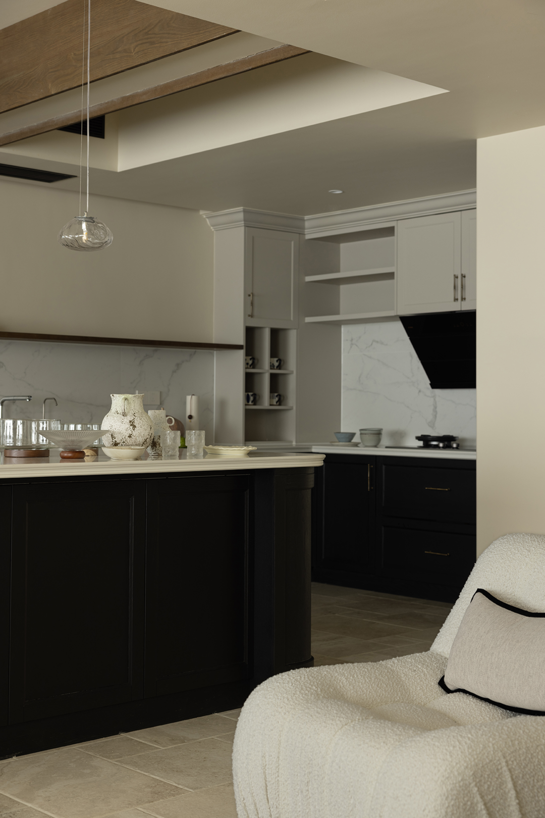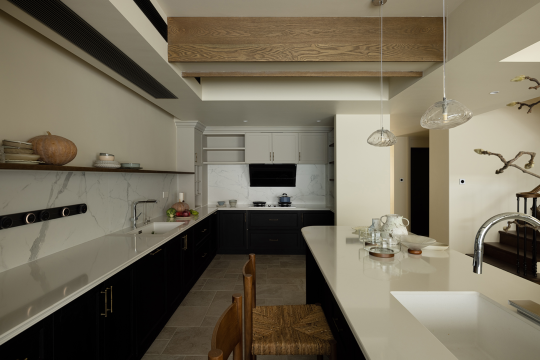 精准的柜体处理让收纳系统隐于无形,当视线穿过中岛台上方的线性吊灯,在台面上洒下的几何光晕,皆成为空间叙事的动态注脚,实用主义与诗意美学在烟火气中达成默契共生。