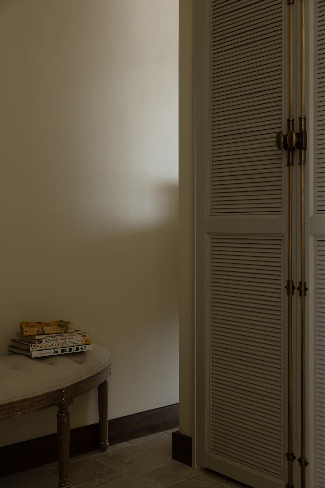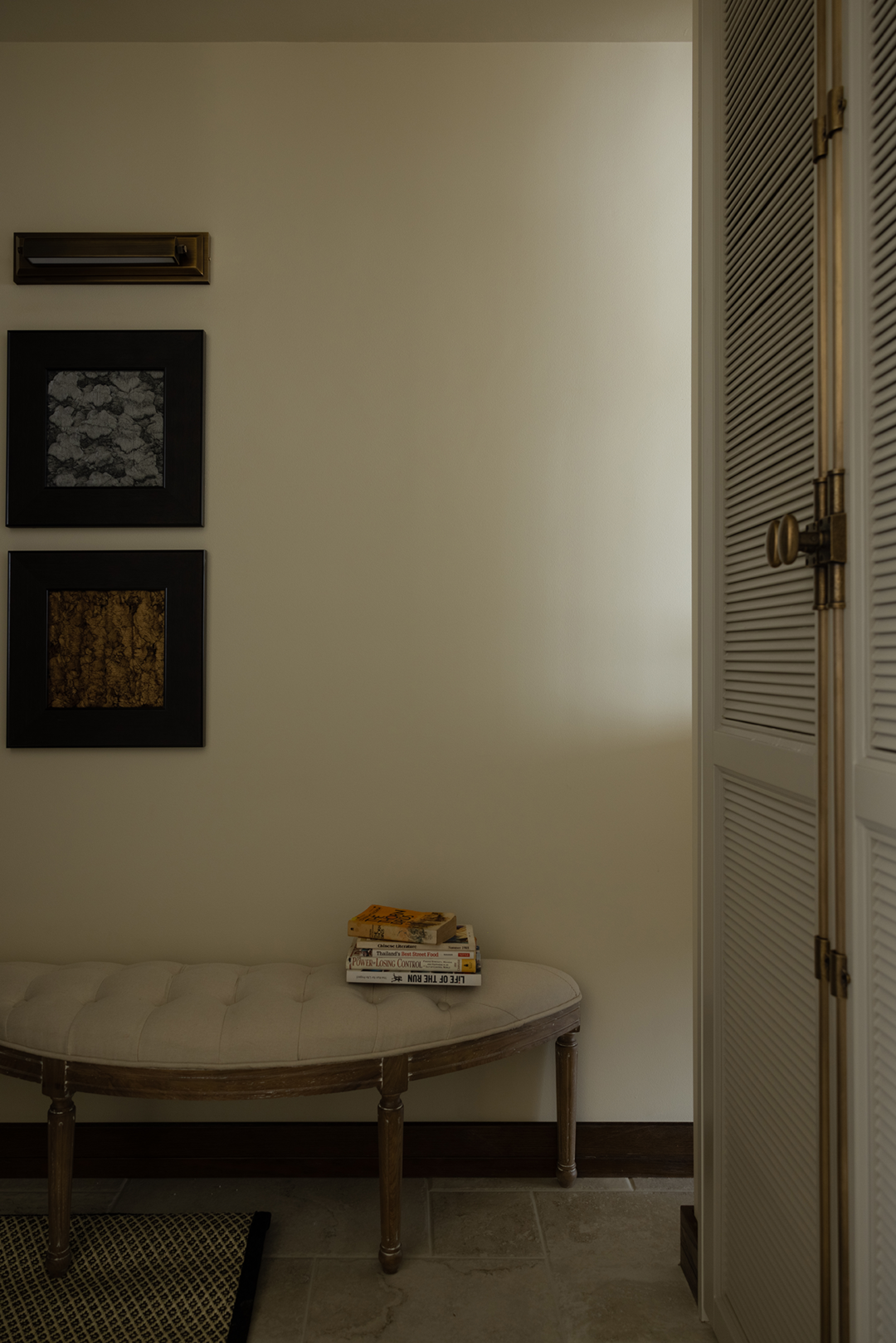 百叶门鞋柜搭配古铜色拉手,与复古坐凳形成材质对话,墙面壁画灯与装饰画的装置,呼应整体空间的调性,在功能与意境的平衡中,完成“归栖”命题的完整表达。
