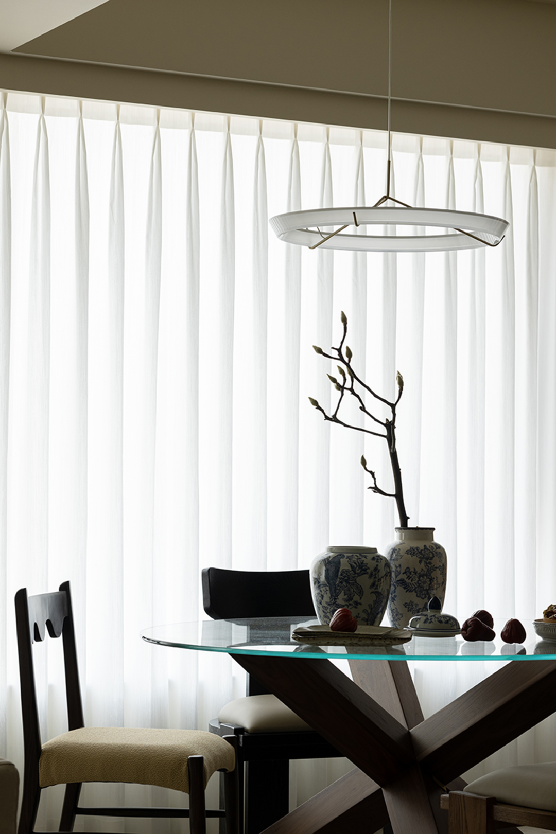 在餐厅空间的设计中,餐桌利用圆形玻璃台面悬浮于胡桃木基座之上,木质纹理与玻璃的通透感形成巧妙的平衡,当阳光穿过纱帘,在瑞士画家汉斯·埃蒙内格尔(Hans Emmenegger)的画作上跃动,与空间产生了奇妙共振。