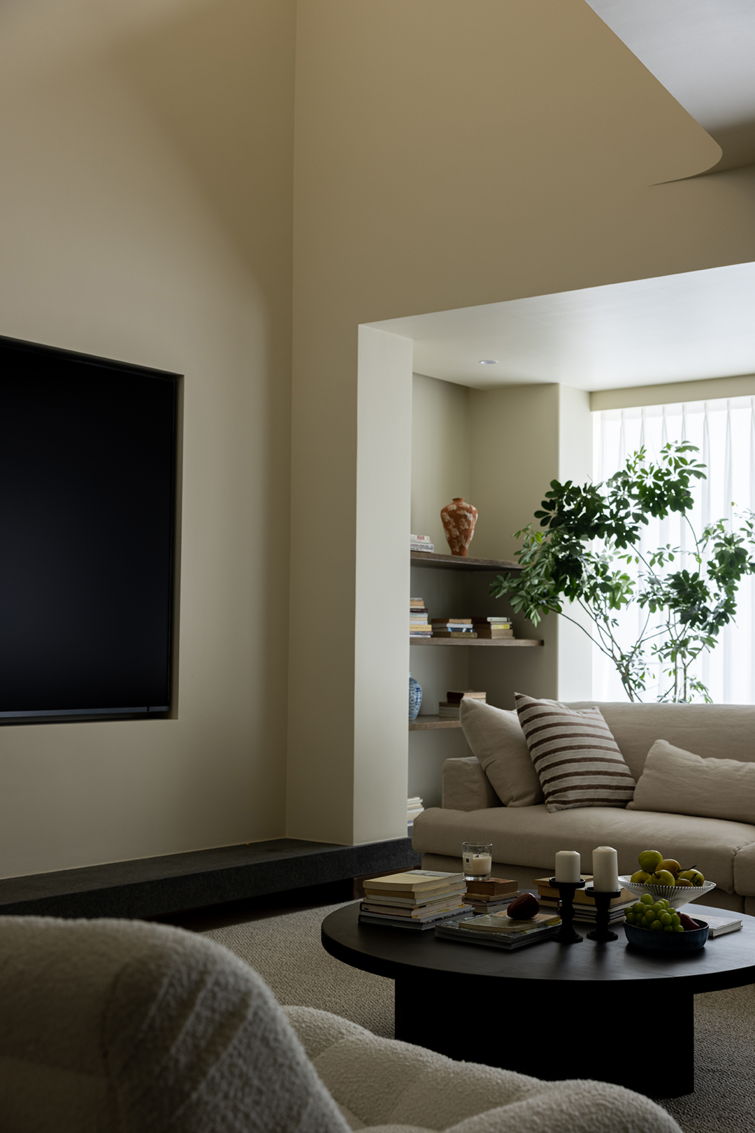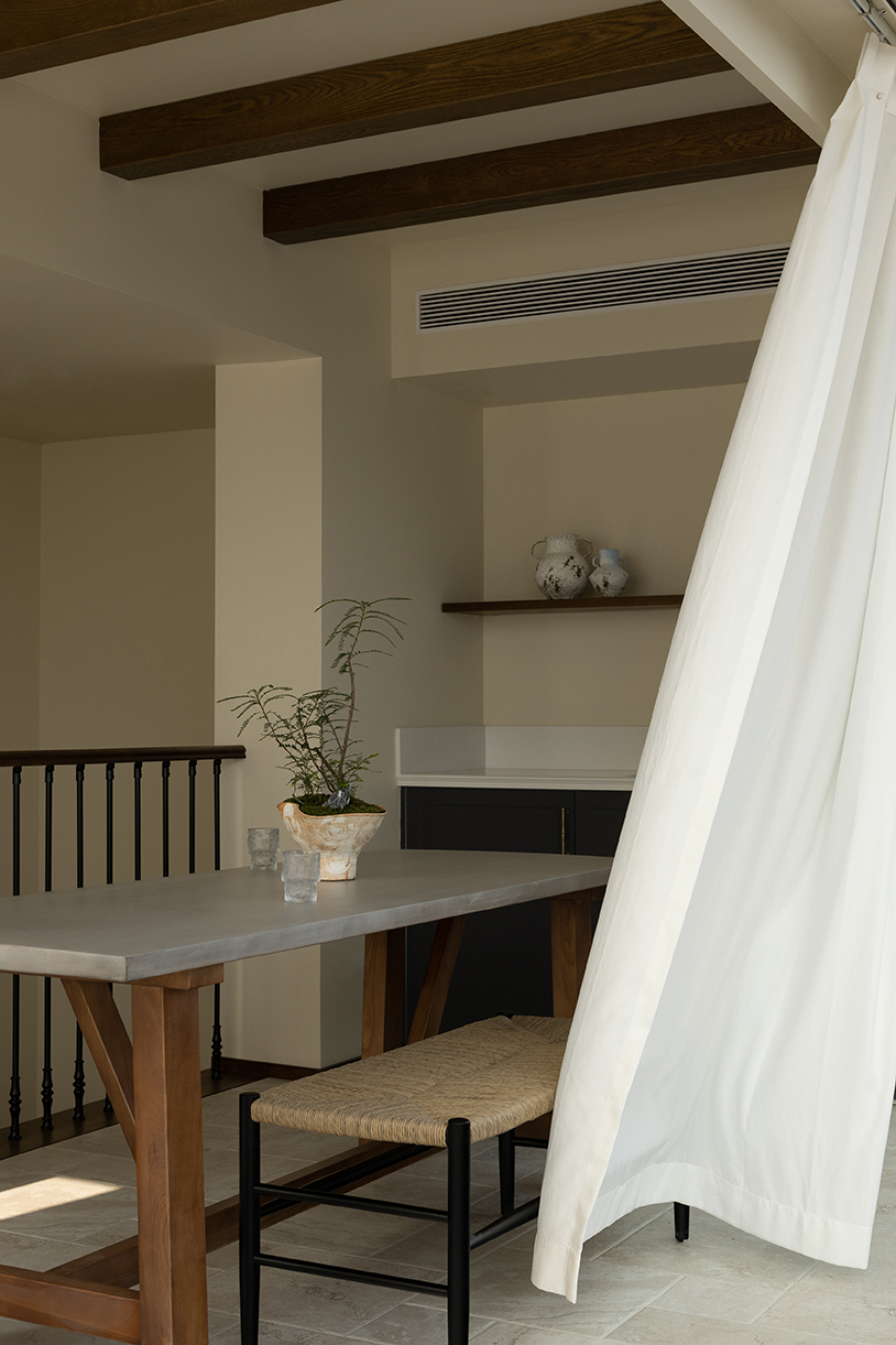 在客厅空间,设计团队通过围合式布局构建起具有呼吸感的社交场域,在亲生物设计理念的指引下,天然材质成为空间的叙事主线,木质元素自带着温润气质与粗砺的莱姆石地砖形成空间对话。