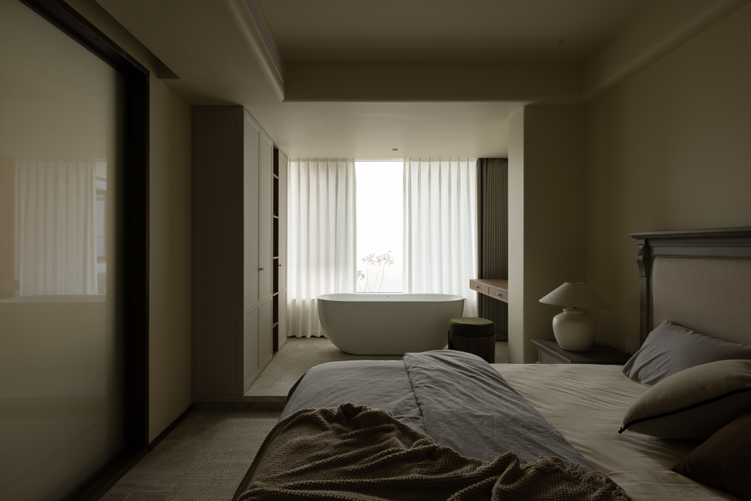 主卧以沉浸式休憩美学重新定义空间节奏,临窗区域通过抬升地台打造阶梯式空间层次,独立浴缸成为了景观容器,当夜幕降临时,氤氲水汽与城市灯火交相辉映。