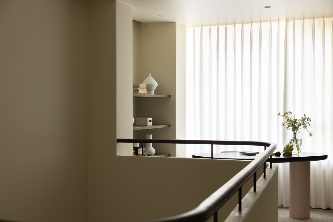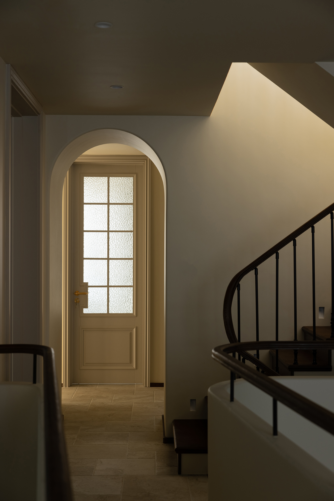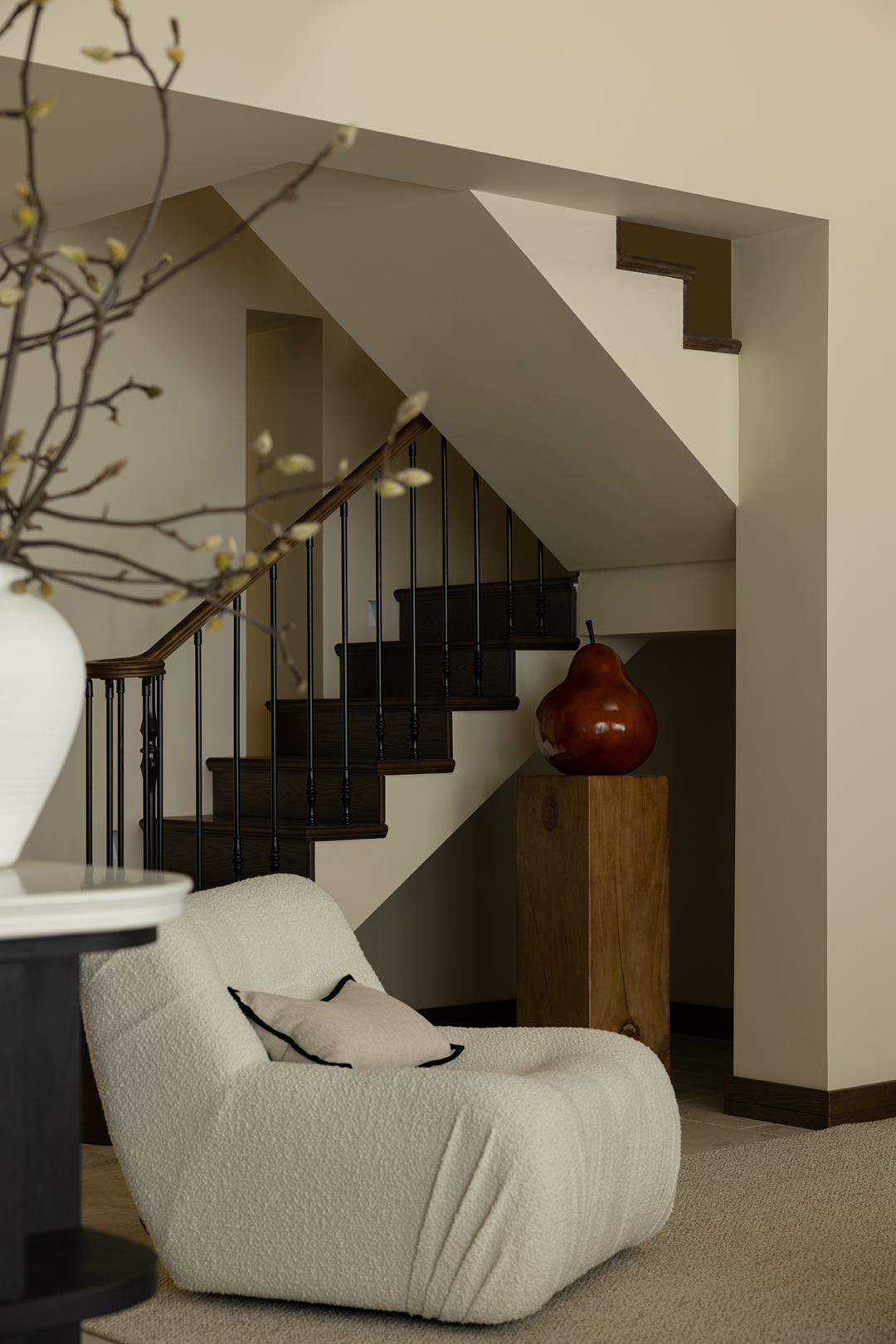 楼梯的首阶踏面进行弧形延展,形成具有邀请意味的过渡空间。胡桃木踏板与铁艺扶手构成力学与美学的二重奏,风格统一且精致,同时,去踢脚线工艺使楼梯从视觉上更为轻盈。楼梯角落的梨形摆件作为视觉标点,其抛光面与踏面木纹形成材质共鸣。