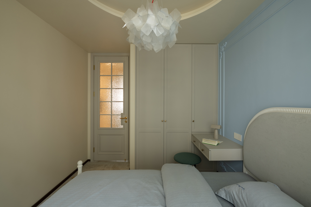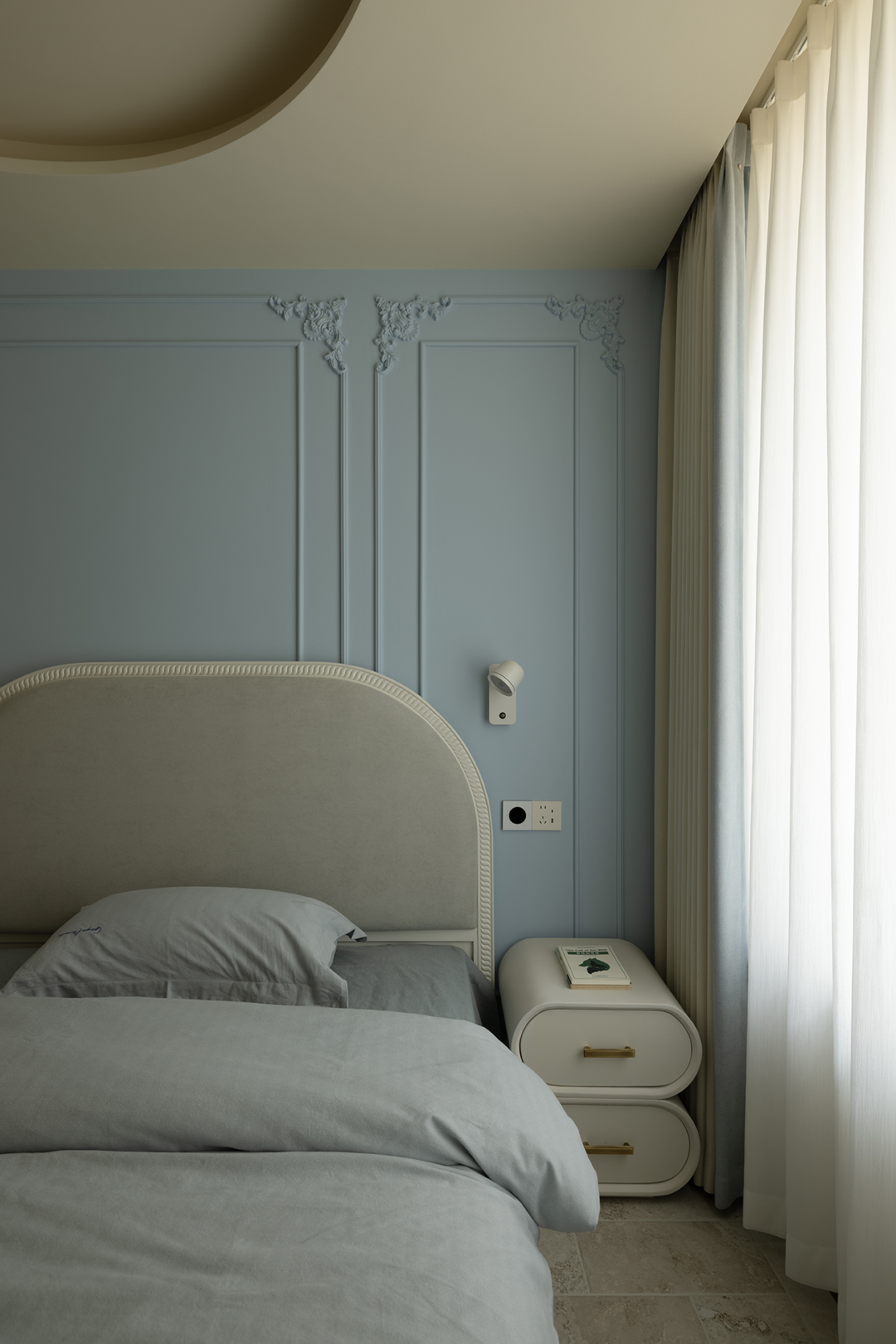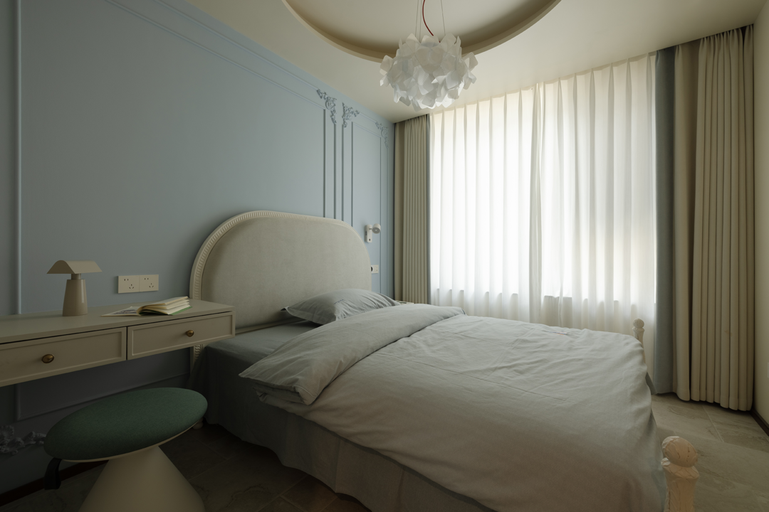 针对女孩房采用浅蓝色艺术涂料铺陈基底,辅以立体石膏线装饰墙面,圆弧形天花吊顶弱化空间棱角,既满足儿童期的童话幻想,亦预留青春期功能迭代的接口。