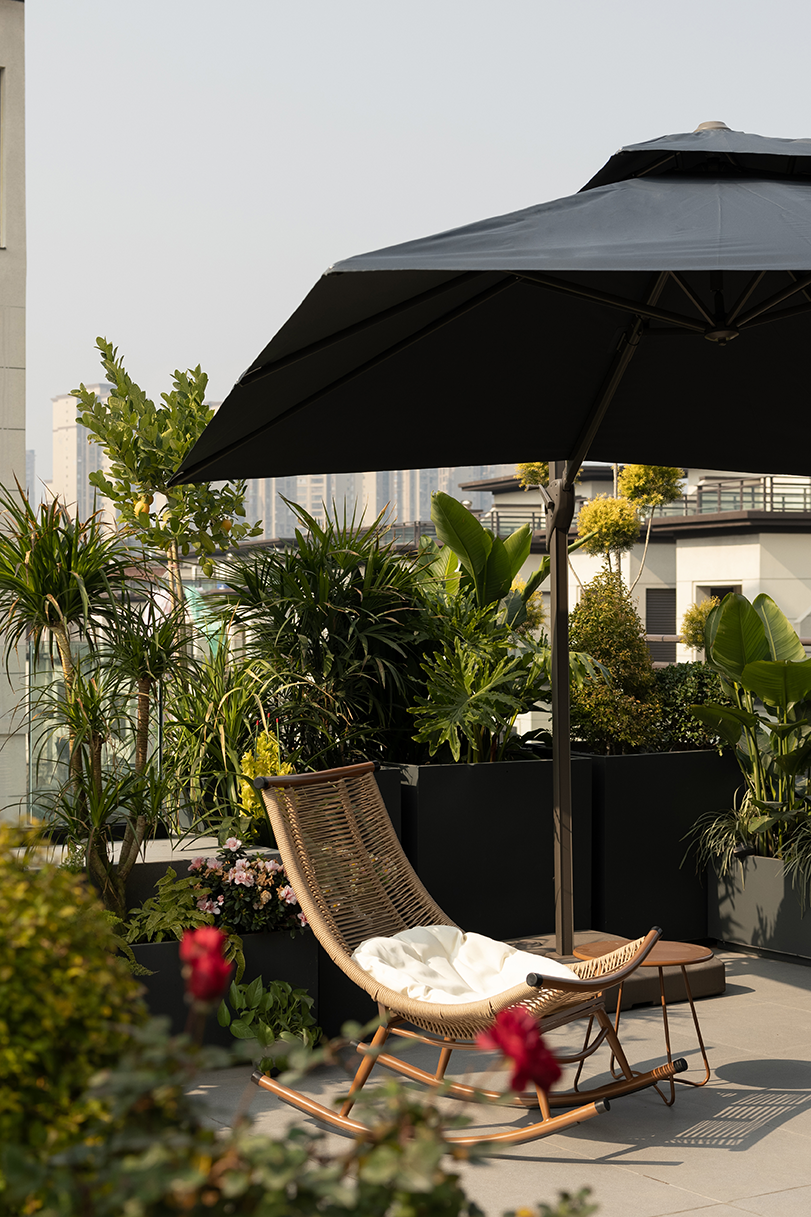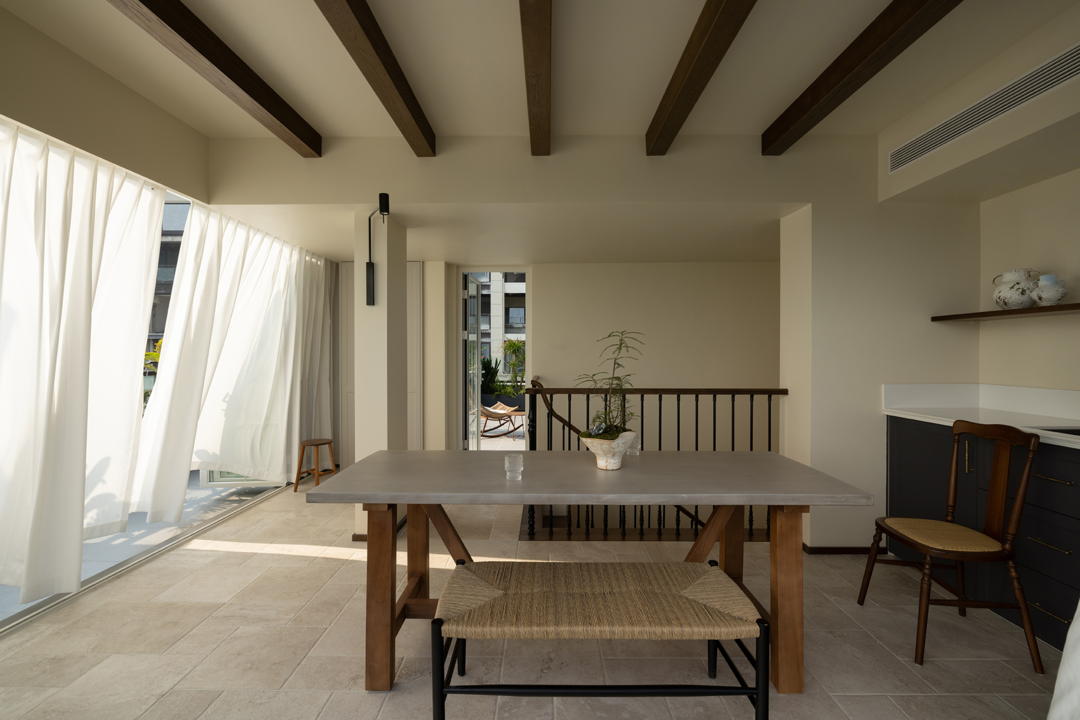 顶层空间则完成室内外的终极对话,茶室借由阳光房的独到优势,与户外花园以折叠门形成连接,不同天气模式下切换使用场景。