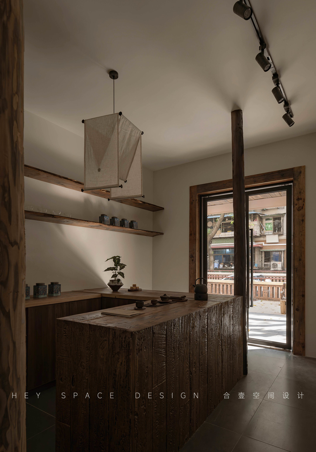 @合壹空间设计:角落的小茶区,仅供两人入座。靠近窗边可望室外居民小院风景。傍晚吊灯洒下柔和光线,如月光轻拂,凸显茶台与茶具之美。周边一块粗麻茶席垫铺,还有木质托盘承载茶叶罐等小物。在这里,每一处细节都散发着自然与时间交织的气息,让人沉浸于品茶的惬意,感受侘寂之美带来的心灵宁静。