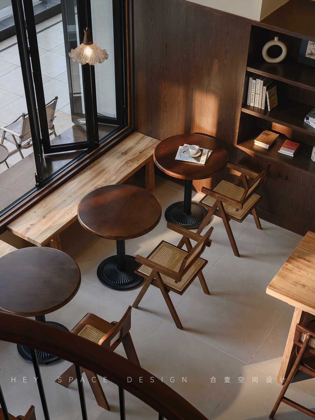 @合壹空间设计:实木圆桌带来的温润的感,透气松弛的实木藤编椅(昌迪加尔椅),松弛始终是咖啡厅的设计关键。