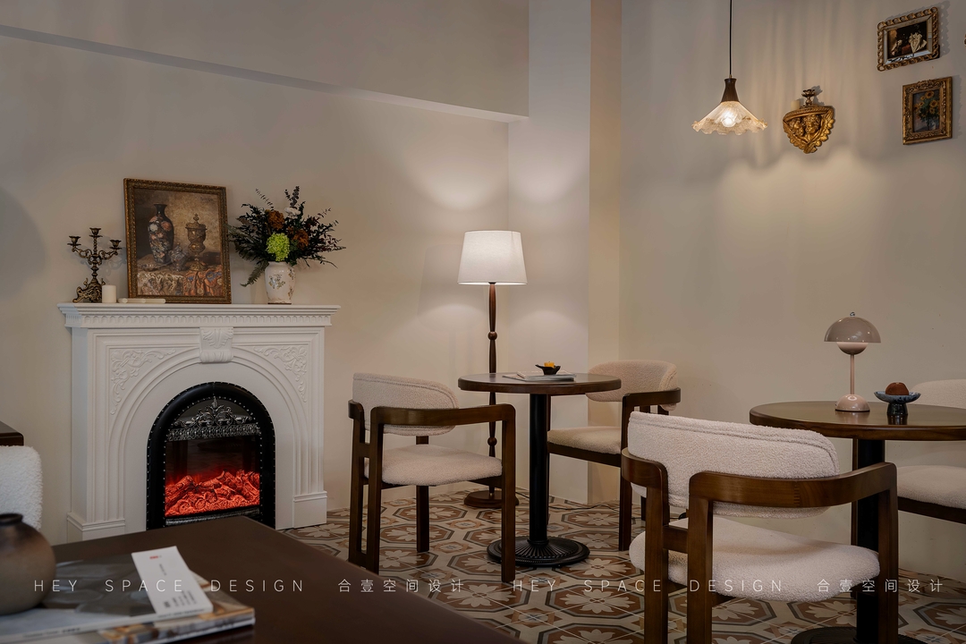 @合壹空间设计:法式的壁炉、装饰画、烛台与花卉摆件,让空间组合成一幅温馨的画面。复古花纹地砖与实木家具彼此呼应,角落绿植为空间增添了几分灵动。
