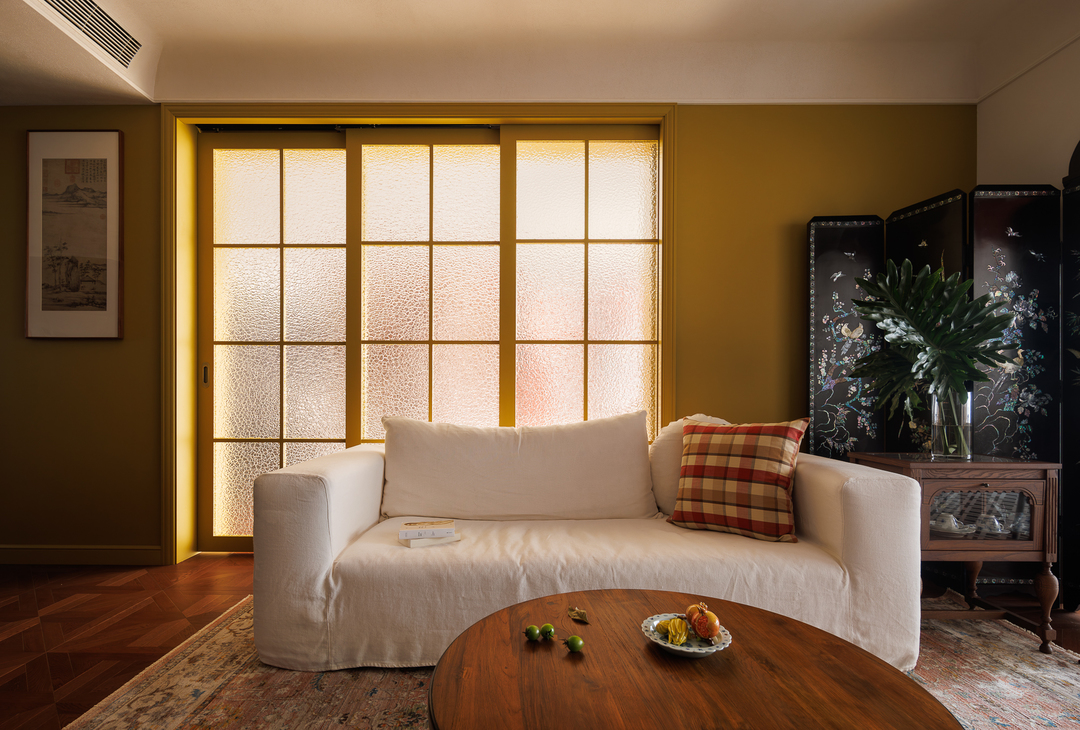 古朴的屏风自然衔接了客厅与阳台,彩色的光泽与古典的花鸟图案形成明亮与内敛的反差,轻盈的华丽之感从角落溢出。