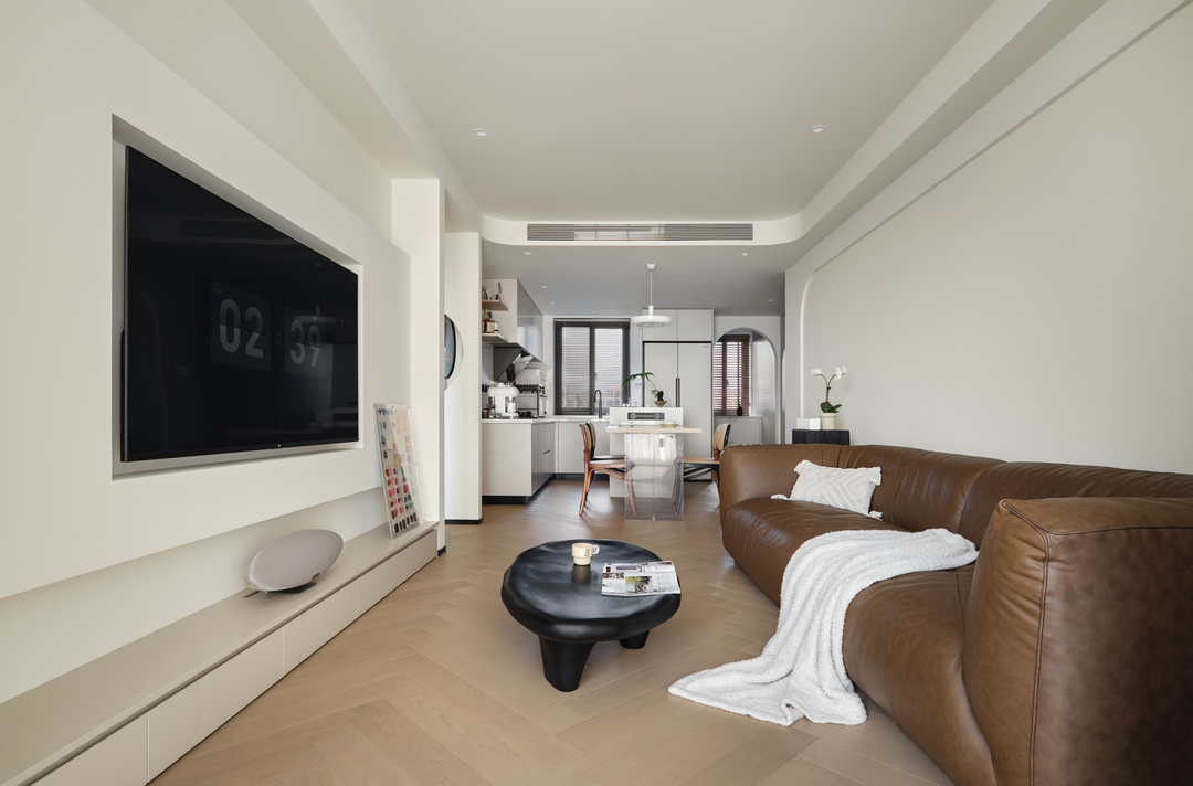 从电视背景墙可观赏到餐厨区域,整个空间呈一字形布局,更显宽敞。棕色皮质沙发稳重典雅,黑色小茶几工艺精湛,展现出艺术感。