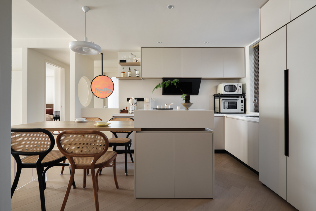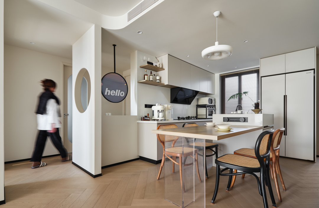 原始餐厅空间利用率不高,改造后餐厅的设计理念融合餐桌和岛台的结构,营造出轻松愉快的用餐体验。岛台上的移动插座,可以边享受美食边处理办公事务,满足多功能空间的需求。此外,简约设计的顶部吊灯增加了整个空间的氛围感,带来舒适温馨的就餐环境。透明亚克力材质用于餐桌支撑,空间更显轻盈通透明亮,餐椅采用藤编材质,展现质朴魅力。