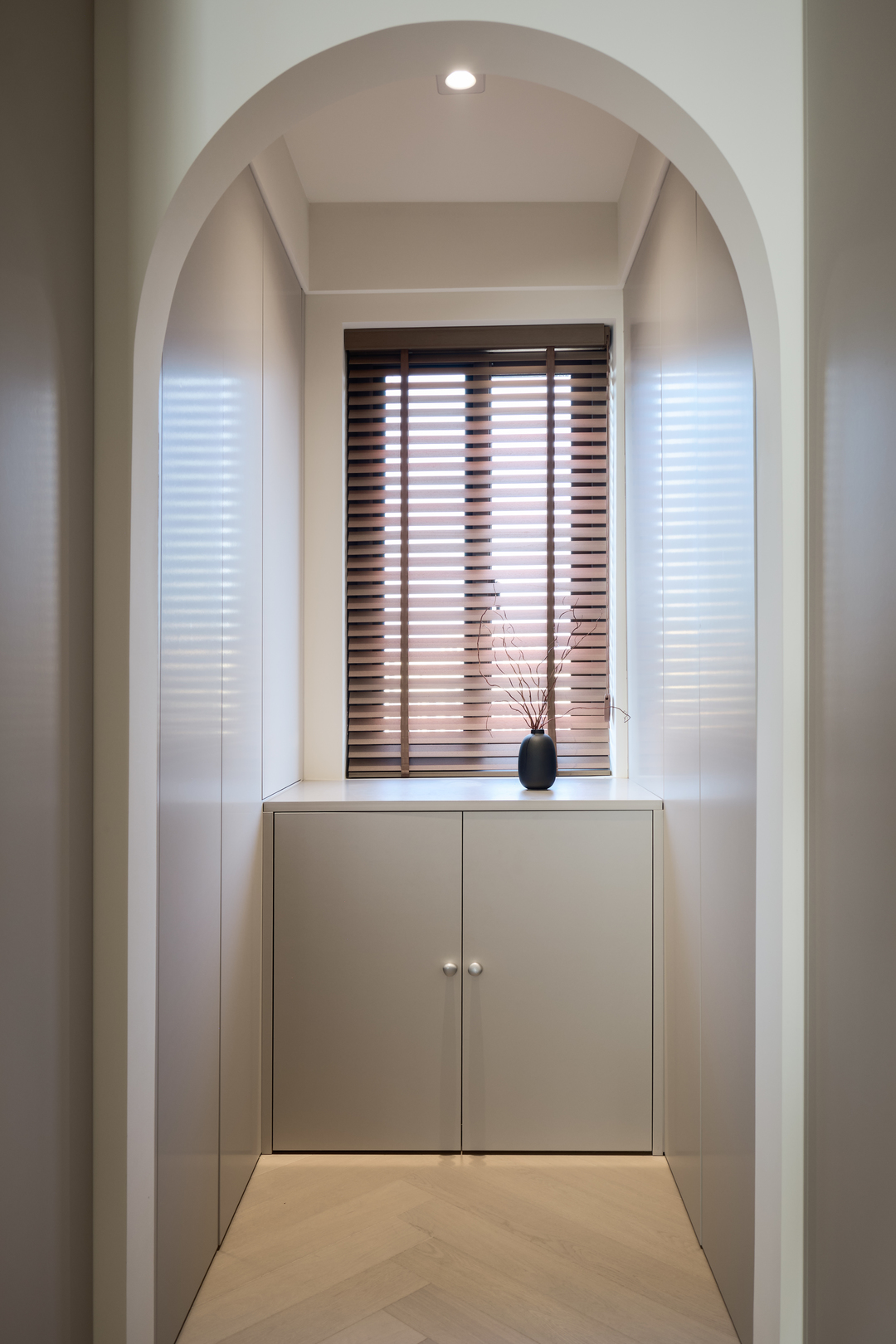 将原始厨房移至新位置,与餐厅一体,形成宽敞的开放空间。原始厨房结合玄关改造为多功能开放储物间3㎡,定制鞋柜衣柜和家政柜一应俱全,方便存放平时收到的快递。利用拱形门洞增加空间延伸感,使整体视觉效果更加宽敞明亮。