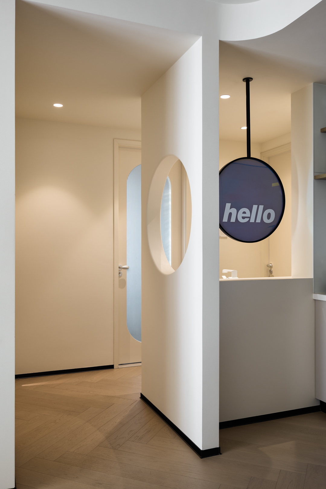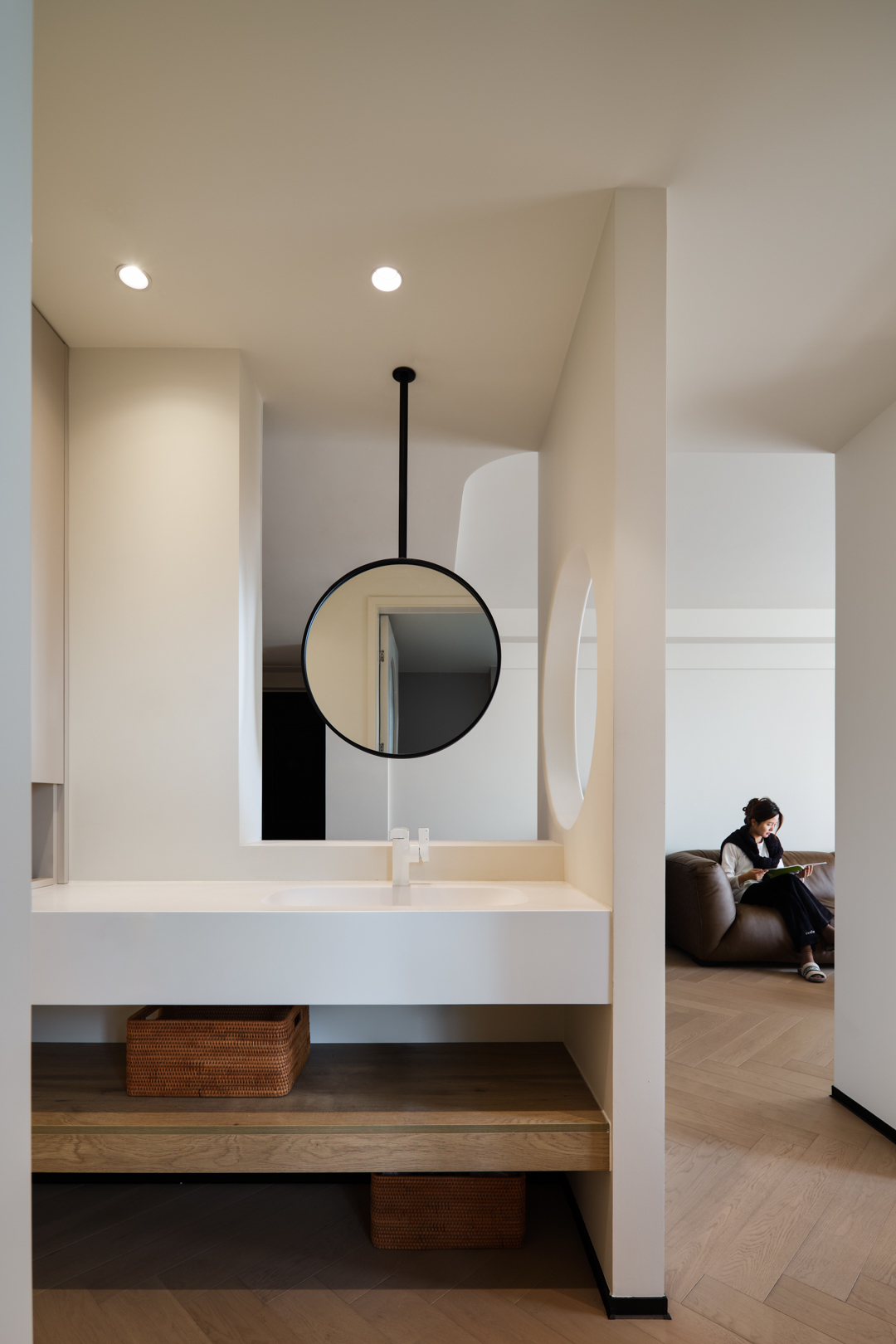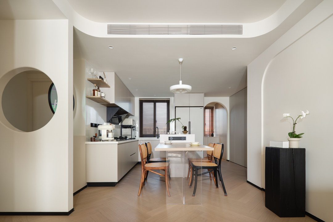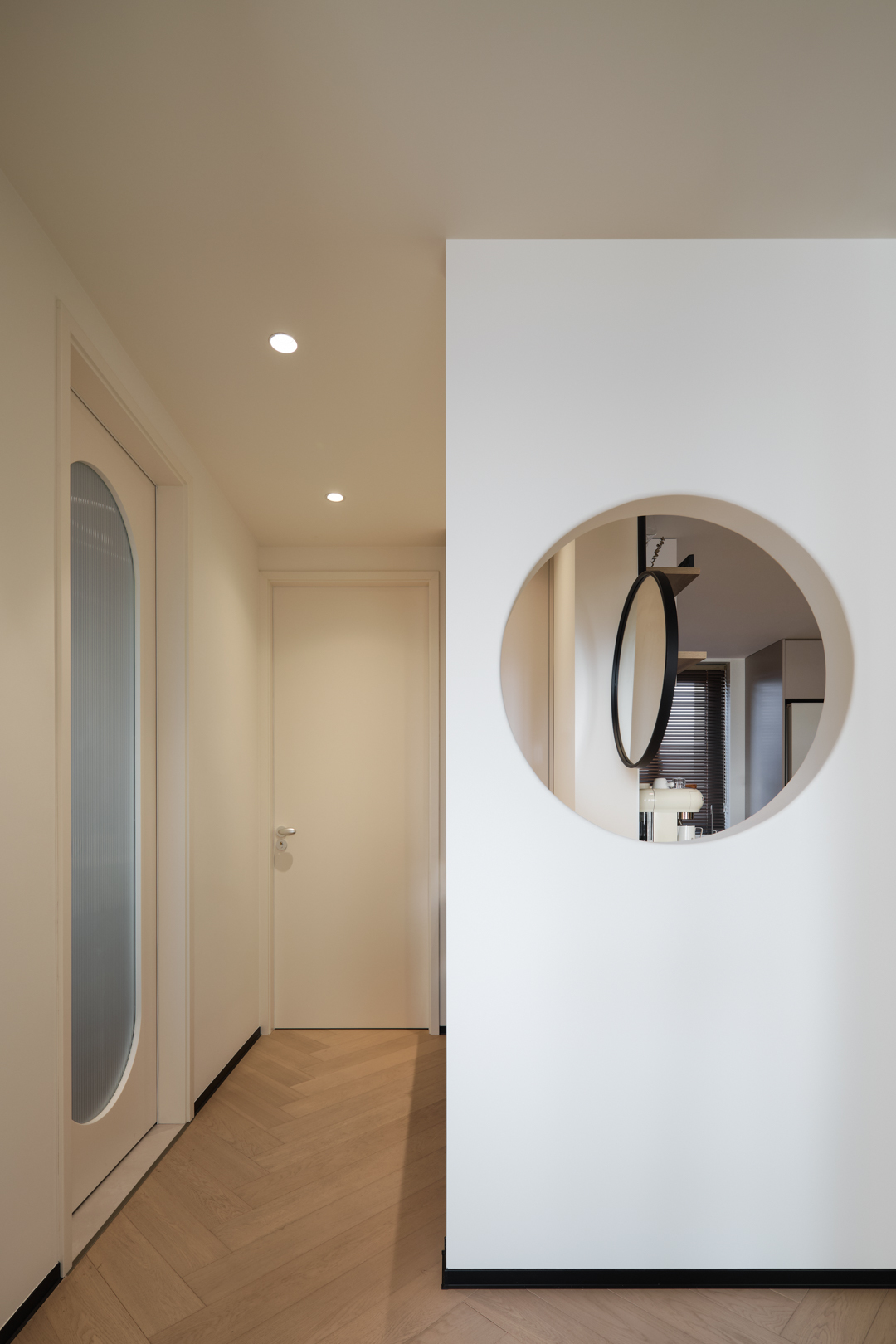 餐厨过道及卫生间干区,墙面采用了圆形镂空设计,与圆形镜面相得益彰,呈现出更具艺术感的效果。
