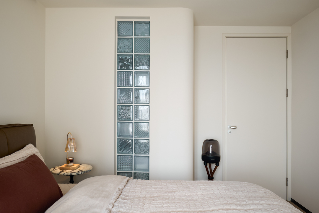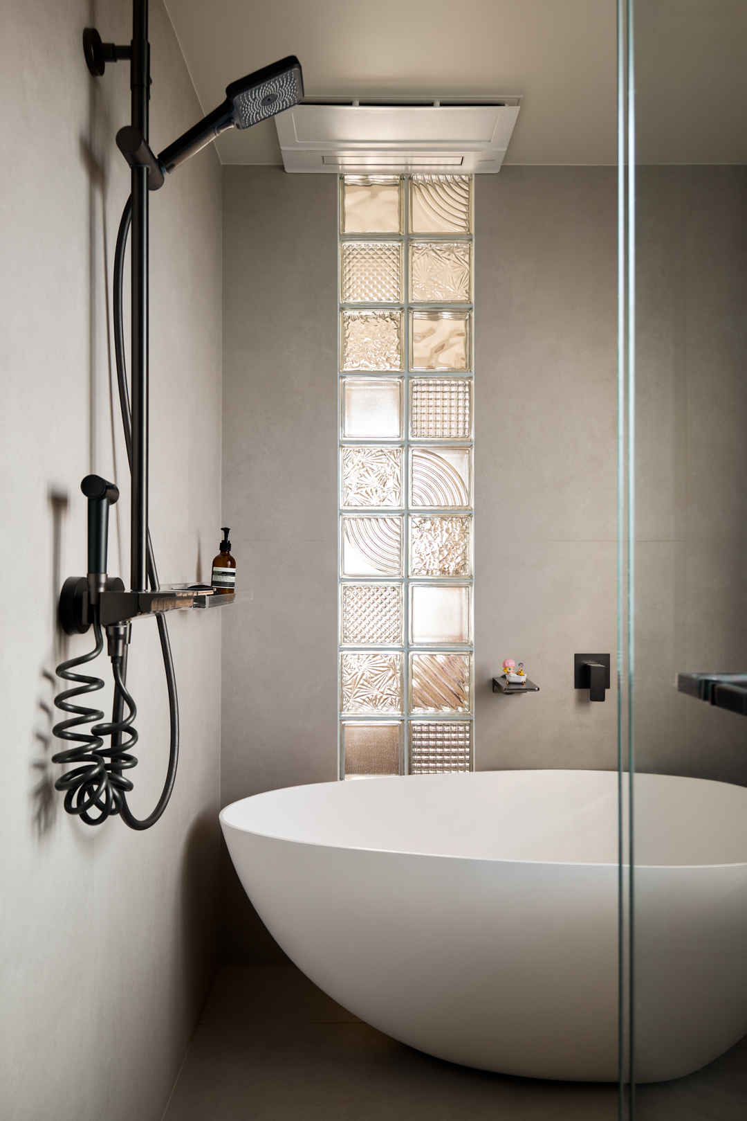马桶区与淋浴区和浴缸(1.5m长)采用玻璃隔断,使用更方便。卫生间墙面采用微水泥材质,质感细腻,更显高级简洁大气。卫生间和卧室之间部分墙面采用高颜值玻璃砖隔断,呈现出半透明的状态,看起来晶莹通透,又能保护隐私。