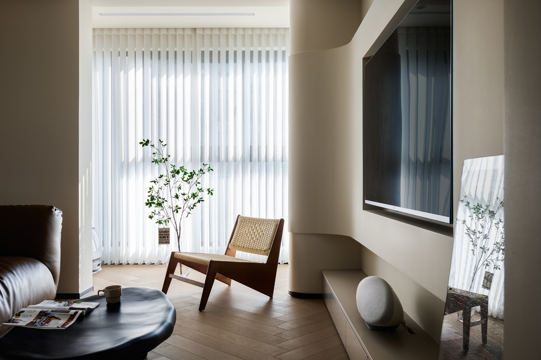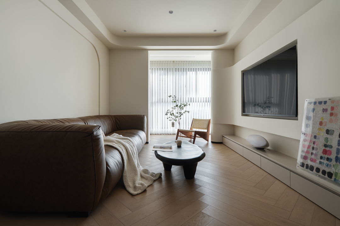 电视背景墙与阳台承重墙之间采用户型造型过渡,增加柔和感。电视背景墙采用嵌入式设计,与背景墙齐平,整体更为整洁。电视柜地柜增加收纳,让卫生无死角。