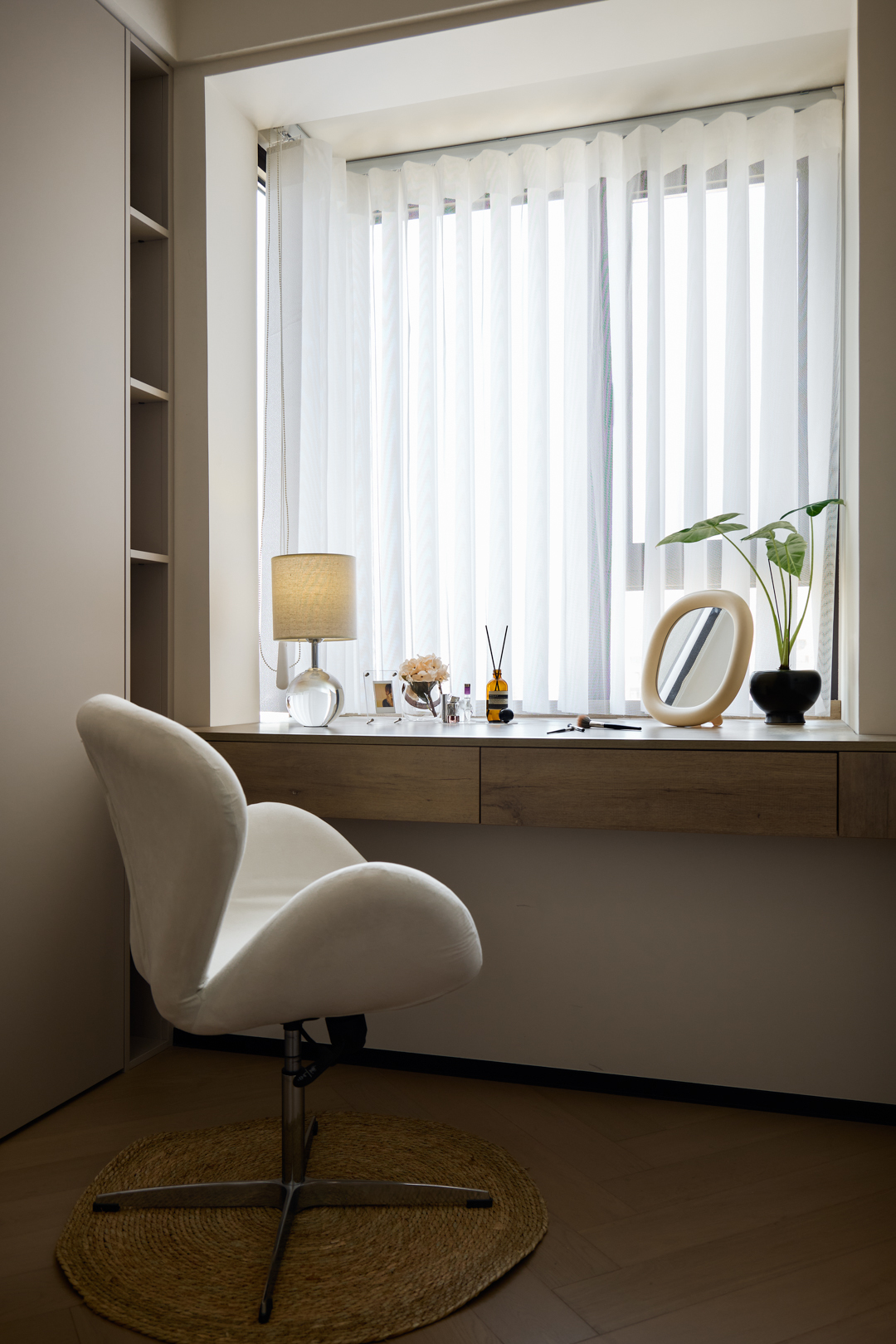多功能房,衣帽间兼化妆室。梳妆台与衣柜组合设计,与窗台一起定制,抽屉桌面增设收纳功能。储物空间更丰富,充分利用房间的每一寸面积,满足各种需求,便捷实用。女主人的美丽之旅从此展开,充满仪式感。