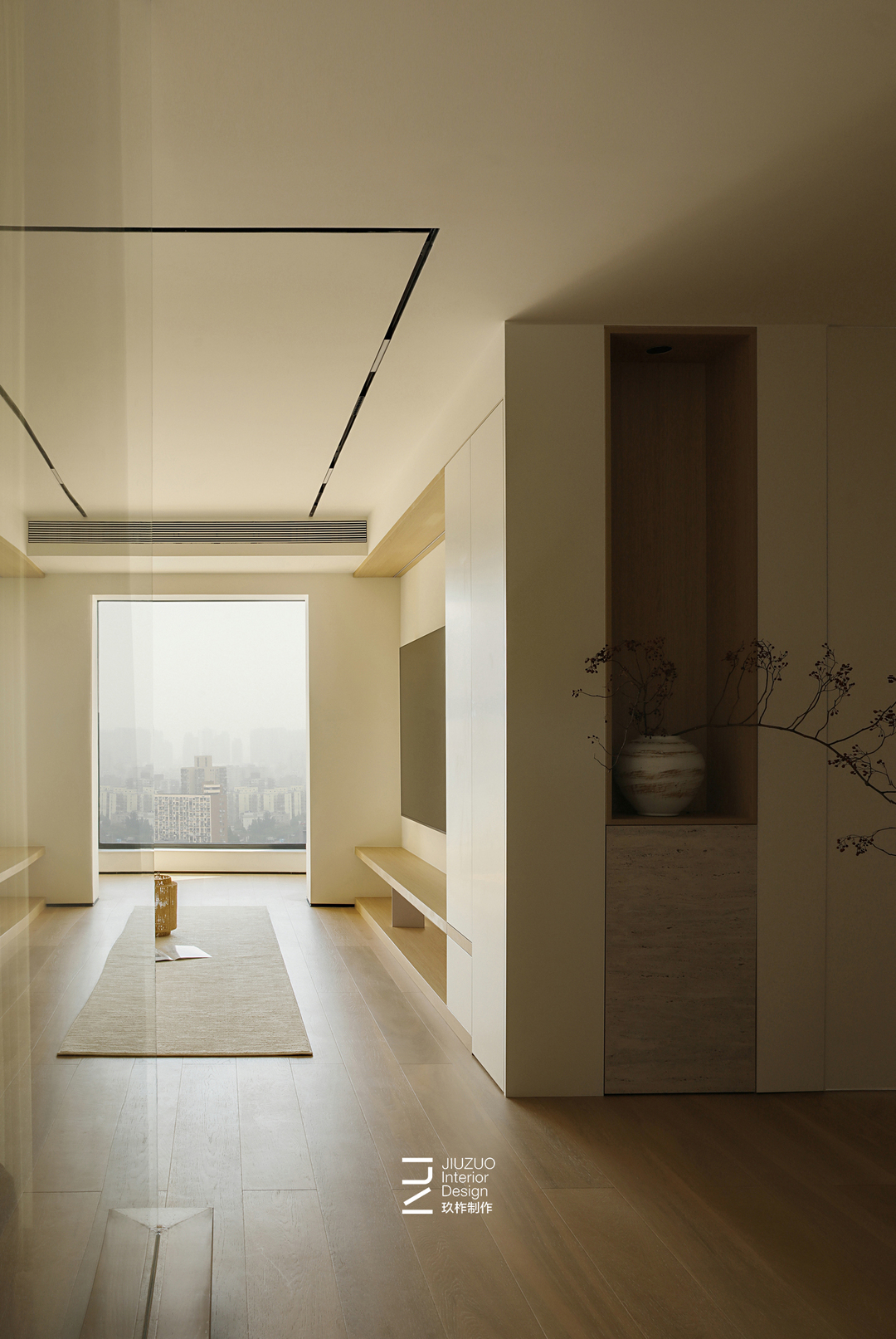 洞石与原木交织,侘寂花瓶中干枝摇曳点缀,营造出自然禅意的空灵意境。